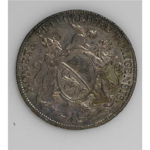 <B>Zurich. 1/2 Taler 1780, </B></I>KM169, choice toned AU-UNC, faint adjustment marks on the reverse.