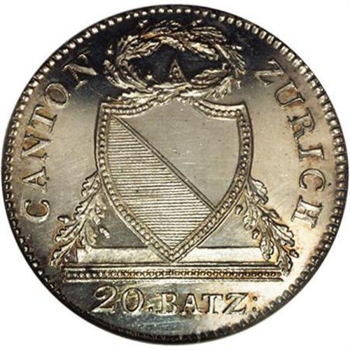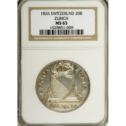 <B>Zurich. 20-Batzen 1826,</B></I> KM-188, MS63 NGC, brilliant and very choice with mirrored fields and an incredible strike resembling that of a more recent Proof. Light gold toning only adds to its charm. This one's worth a real premium over catalogue value.<BR><BR><b>Shipping:</b> Coin/Currency (<a target="_blank" href="http://www.heritageauctions.com/common/shipping.php">view shipping information</a>)