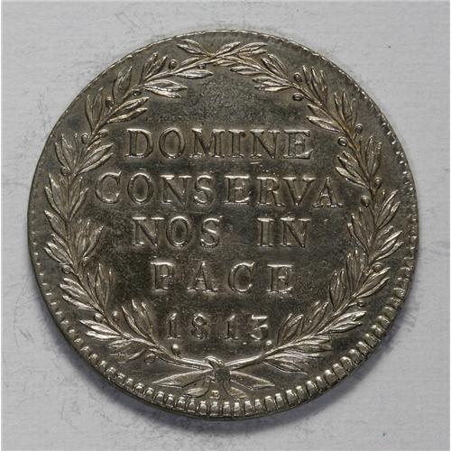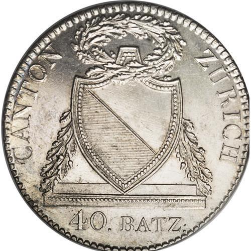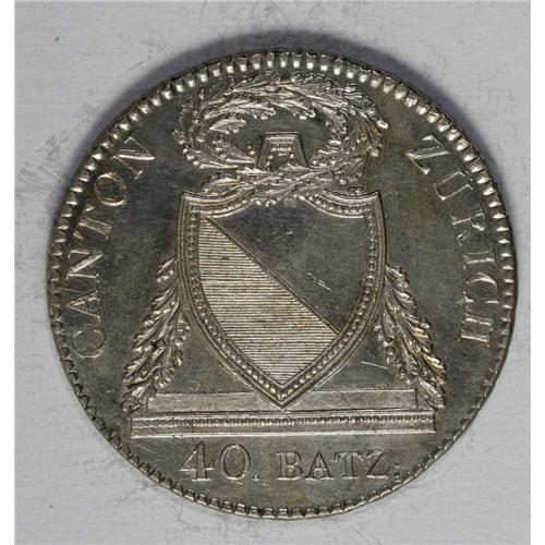 <B>Zurich. 40-Batzen 1813-B,</B></I> KM-191, especially Choice AU-UNC with a really bold strike giving it great eye-appeal, along with light silvery gold iridescent toning. Hardly a mark to be found, either. Crest of the canton combined with its Latin motto asking for God's peace and protection.<BR><I>From the Monedas Oro Collection</B></I><BR><BR><b>Shipping:</b> Coin/Currency (<a target="_blank" href="http://www.heritageauctions.com/common/shipping.php">view shipping information</a>)