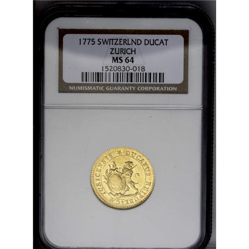 <B>Zurich. Gold Ducat 1775, </B></I>KM161, MS64 NGC, gorgeous brilliant surfaces, small weak area on the reverse. An extremely attractive coin with instant eye appeal.