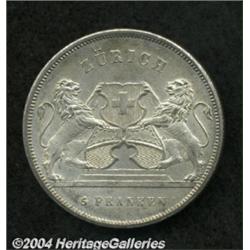 Zurich Shooting 5 Franken 1859, Lions supporting three shields/Warrior standing with rifle, KMS5, lightly toned, Choice Uncirculated. Important notice: Heritage usually auctions material at the rate of 200-250 lots per hour. On some occasions eBay Live bid software or the Internet may not be able to keep up with the pace of the auction. We recommend placing a realistic absentee bid now as insurance to avoid disappointment. Occasionally the auctioneer may eliminate or reject an eBay Live bid, and the auctioneer may also reopen a lot after the close of the eBay live bidding (usually because we missed an audience bid), and may reject your bid even if it shows you as the winning bidder. By bidding via eBay Live, you agree that Heritage may award the lot to another bidder at its sole discretion under the circumstances described above or any other reasonable circumstances. Also please note that all Heritage lots purchased through eBay Live carry a 20% Buyer's Premium. Please make sure you read the Terms and Conditions before you bid.