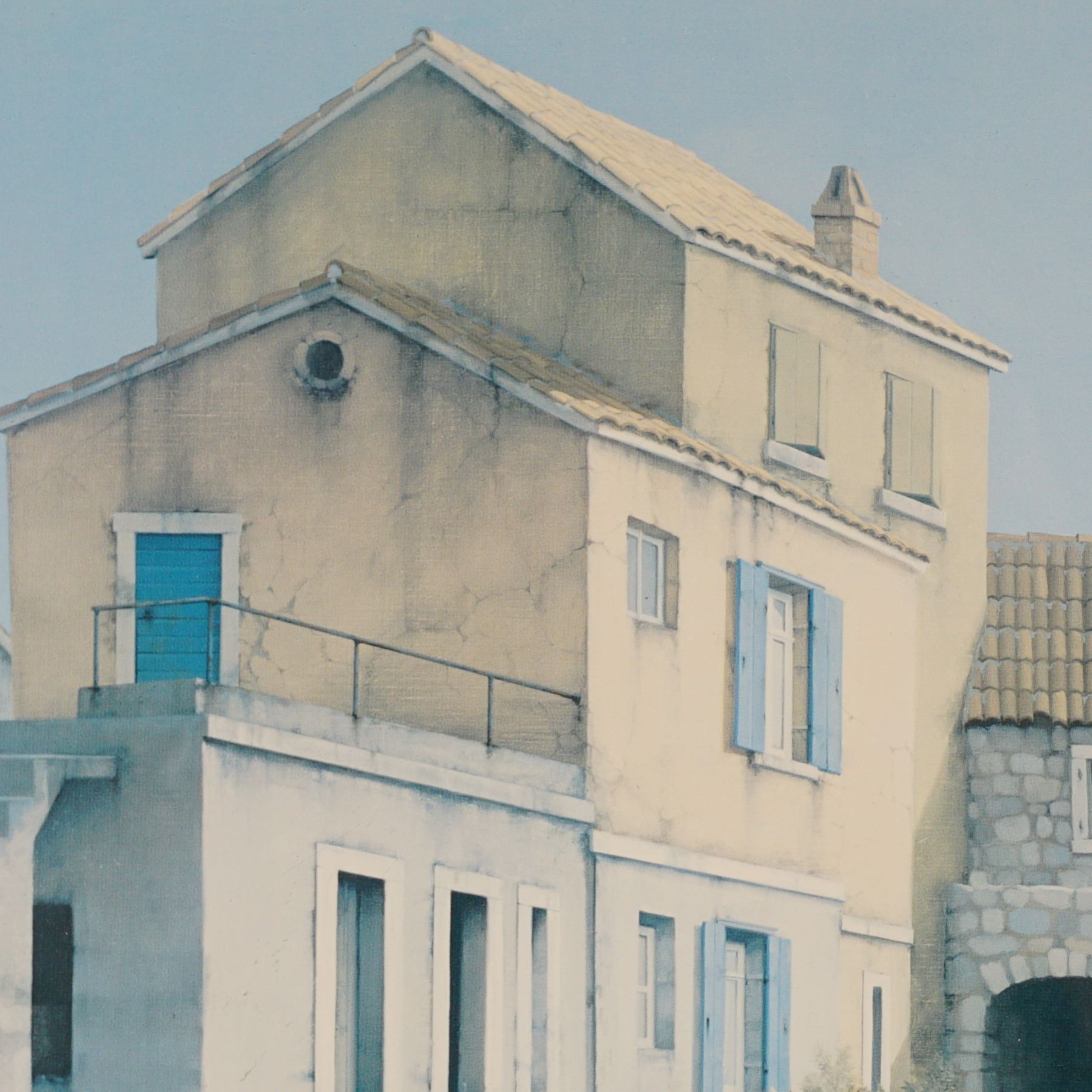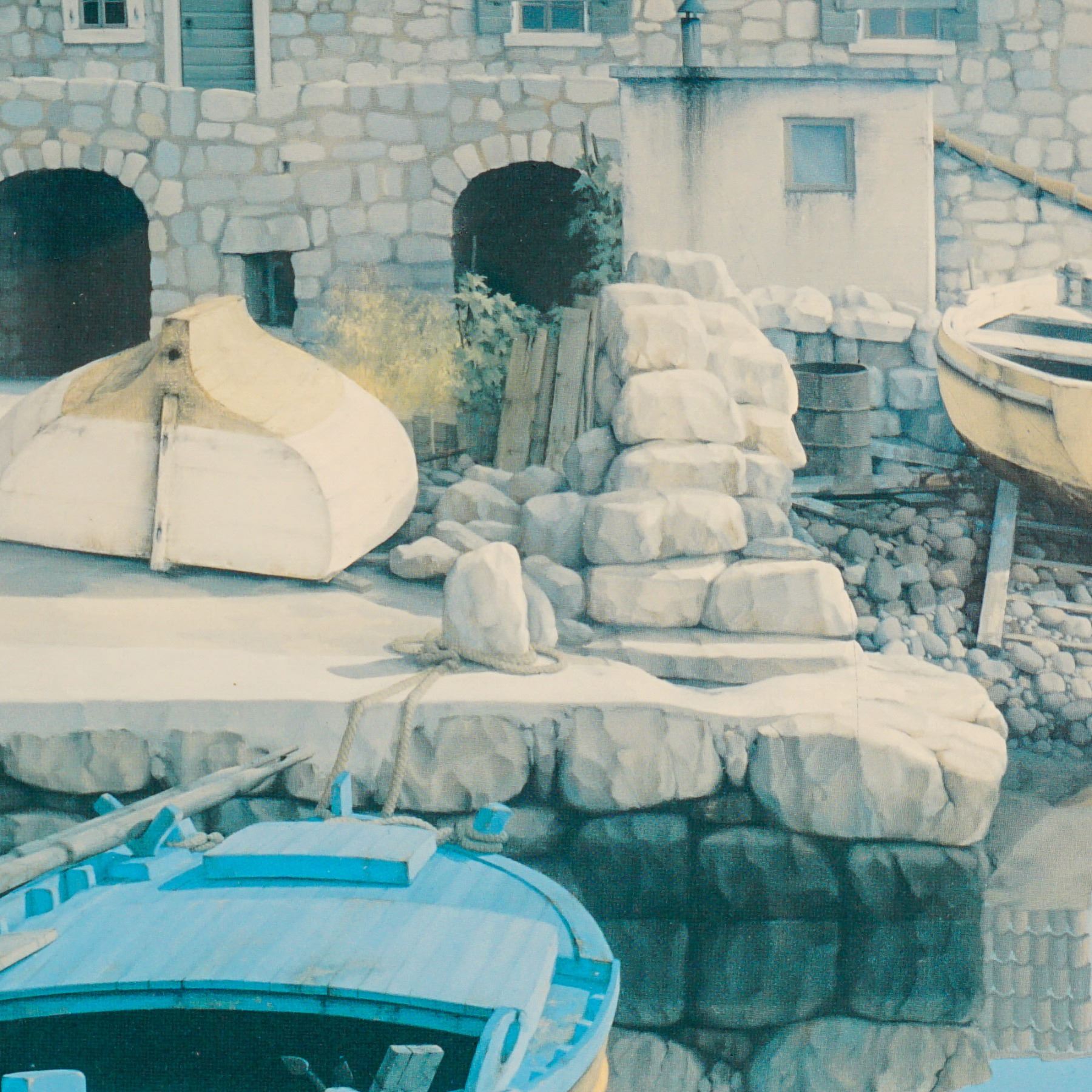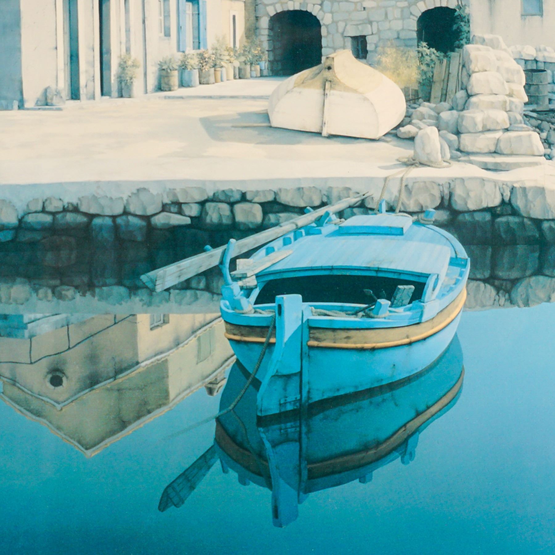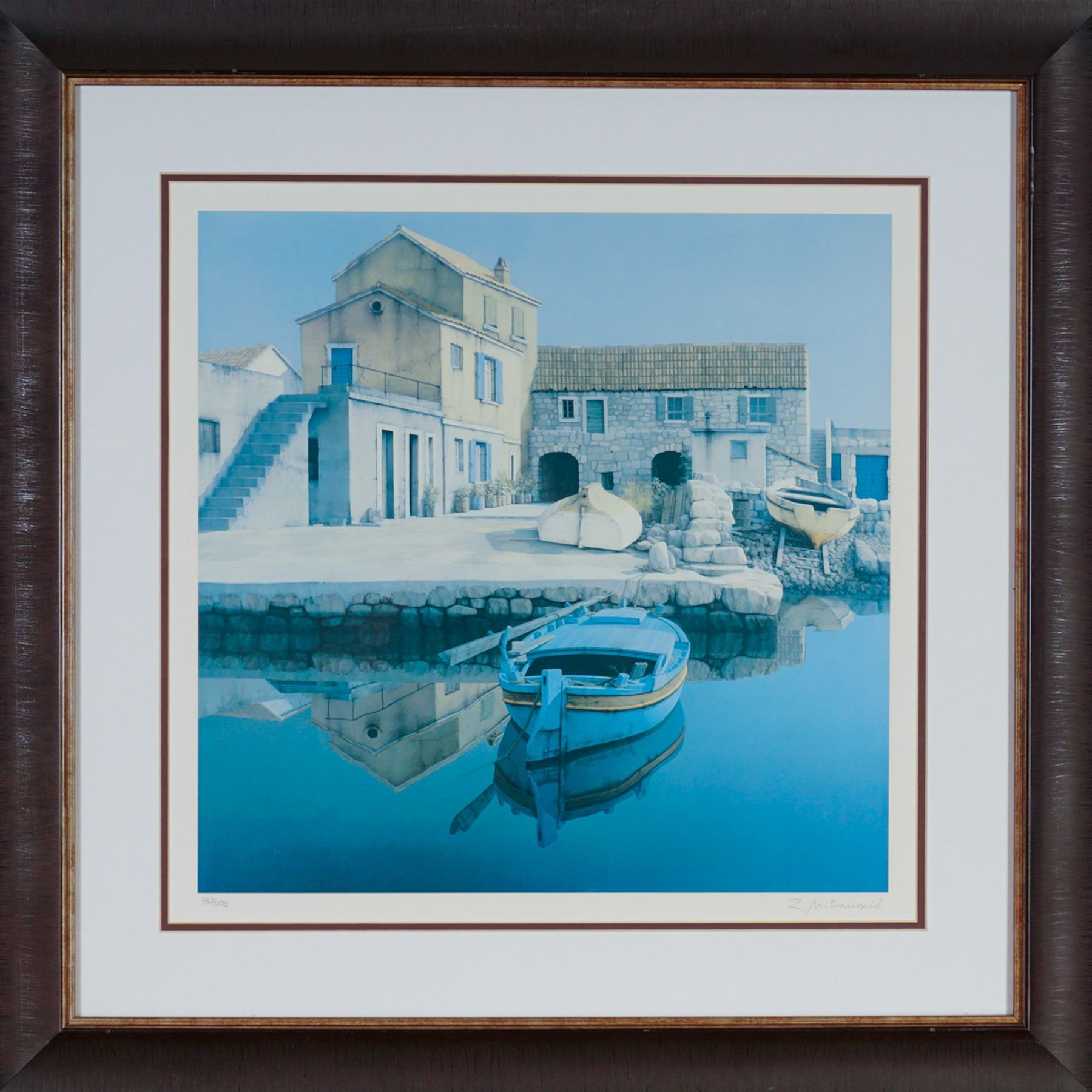 Serene color lithograph by Croatian artist Zvonimir Mihanovic. The composition captures a tranquil coastal village scene featuring pastel-toned stone houses, calm reflective waters, and a blue moored boat at the foreground. Known for his meticulous realism and mastery of light, Mihanovic's works evoke the stillness and clarity of Adriatic seaside towns. Elegantly presented in a double mat with a wood frame and wired for hanging. Numbered 82/275 and signed in pencil lower right.