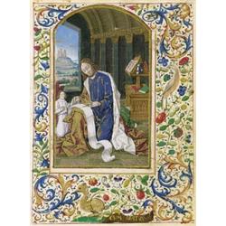 Der Evangelist Matthäus mit dem Engel. Miniatur auf Pergament aus einem französischen Stundenbuch um 1450. - Ebenso, jedoch verso mit Text in Braun.