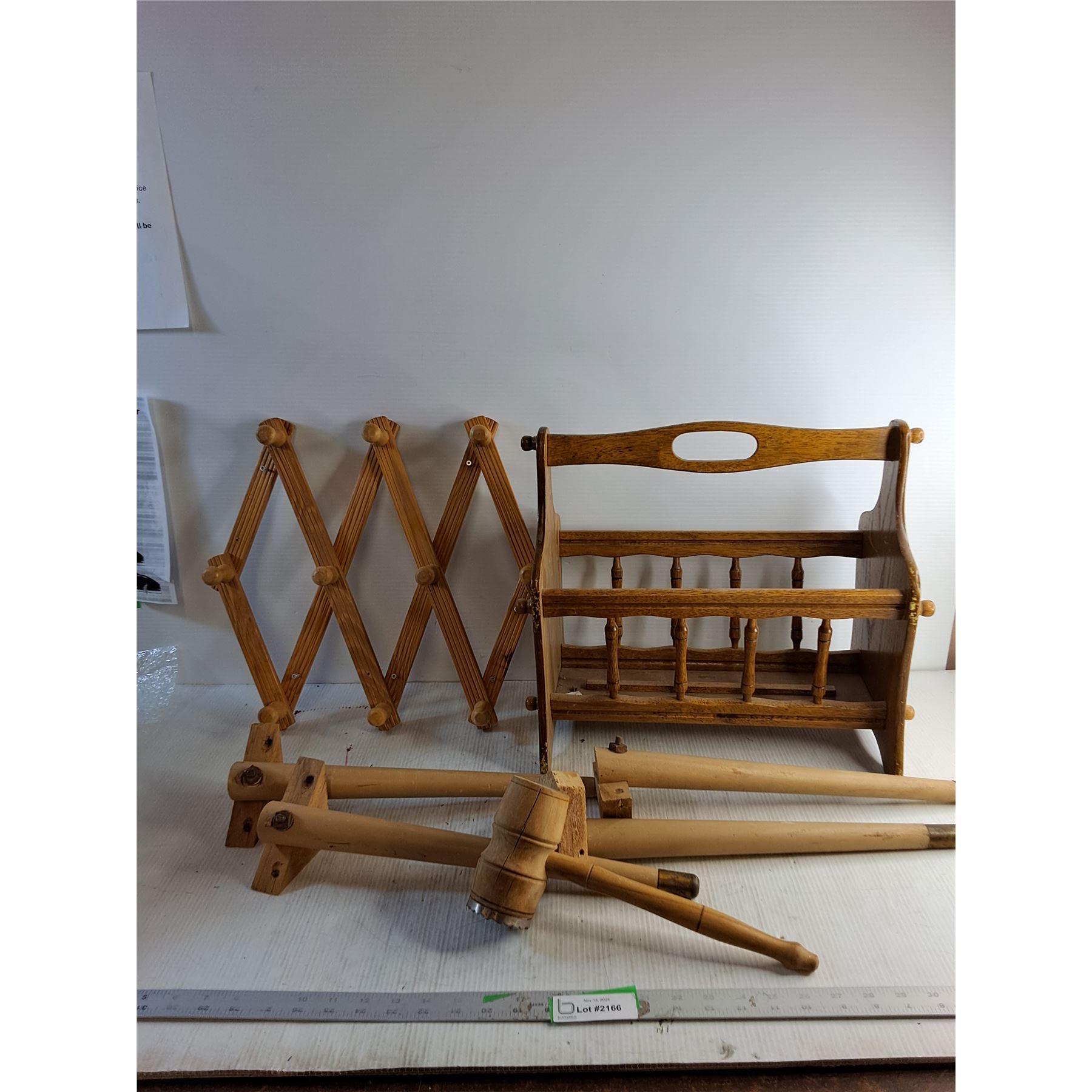 Wooden - Magazine Rack 15" x 8" x !5"/ (4) Legs 16"/ Meat Mallet/ Towel Wall Hanger