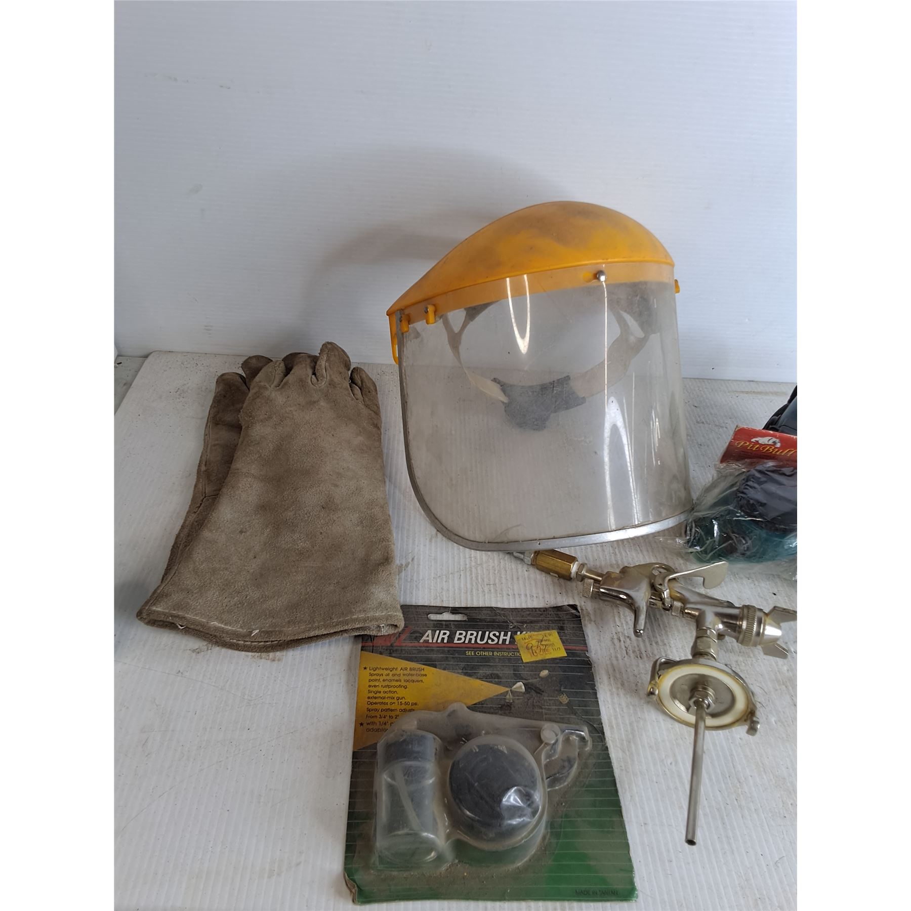 Welding Gloves, Welding Sheild, Welding Goggles (2), Air Brush, Wire Brush, Misc
