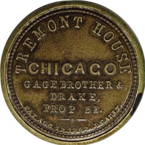 <B>HB-123 EP-114 10¢ Tremont House Gage Brothers & Drake Extremely Fine.</B></I> The case is a lovely deep, olive brown with a small stain at the left tab. The stamp is somewhat faded, and the mica shows some minor marks and crazes. <I>ex-Stack's 6/2004 Lot 622.</B></I><BR><BR><b>Shipping:</b> Coins & Currency (<a target="_blank" href="http://www.heritageauctions.com/common/shipping.php">view shipping information</a>
