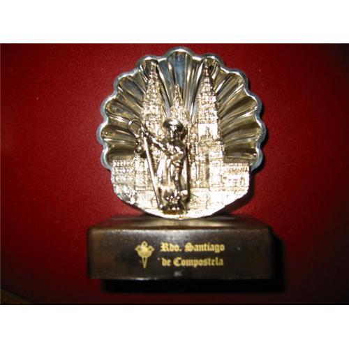 This beautiful and meaningful 5 inch memorabilia represents Spain, Religious, building and figure. A metal silvertone Sea shell shields the religious figure, and are situated on a brown hard plastic stand. The base indicates Zaragoza, a symbol and engraved prints in spanish. On the stand incripted with gold "Rdo Santiago de Compostela with religious symbol. This Memorabilia is detailed, decorative and in very good condition, vintage imperfection. Something to think about!