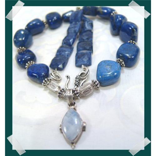 ... a bold presentation of rich deep color of natural lapis nuggets and fully facet chicklet gemstones accented with contrasting shapes complimented with Karen tribal silver. A real winner and you will not see your neighbor sporting the same necklace! A gram weight of 120 with an overall length of 17.5". The center complimentary moonstone pendant has a measurements of 35x16mm for perspective to size. For those not familiar with metric 25mm=1". (item 4400)