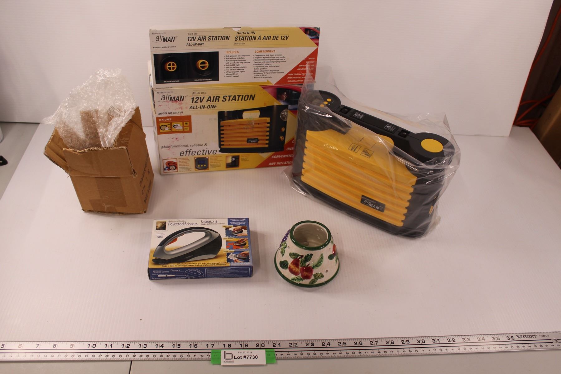 airMAN 12v Air Station (New in Box), Automatic/Cordless Powered Scissors (New in Box) & Small Candle Shade (New in Box)