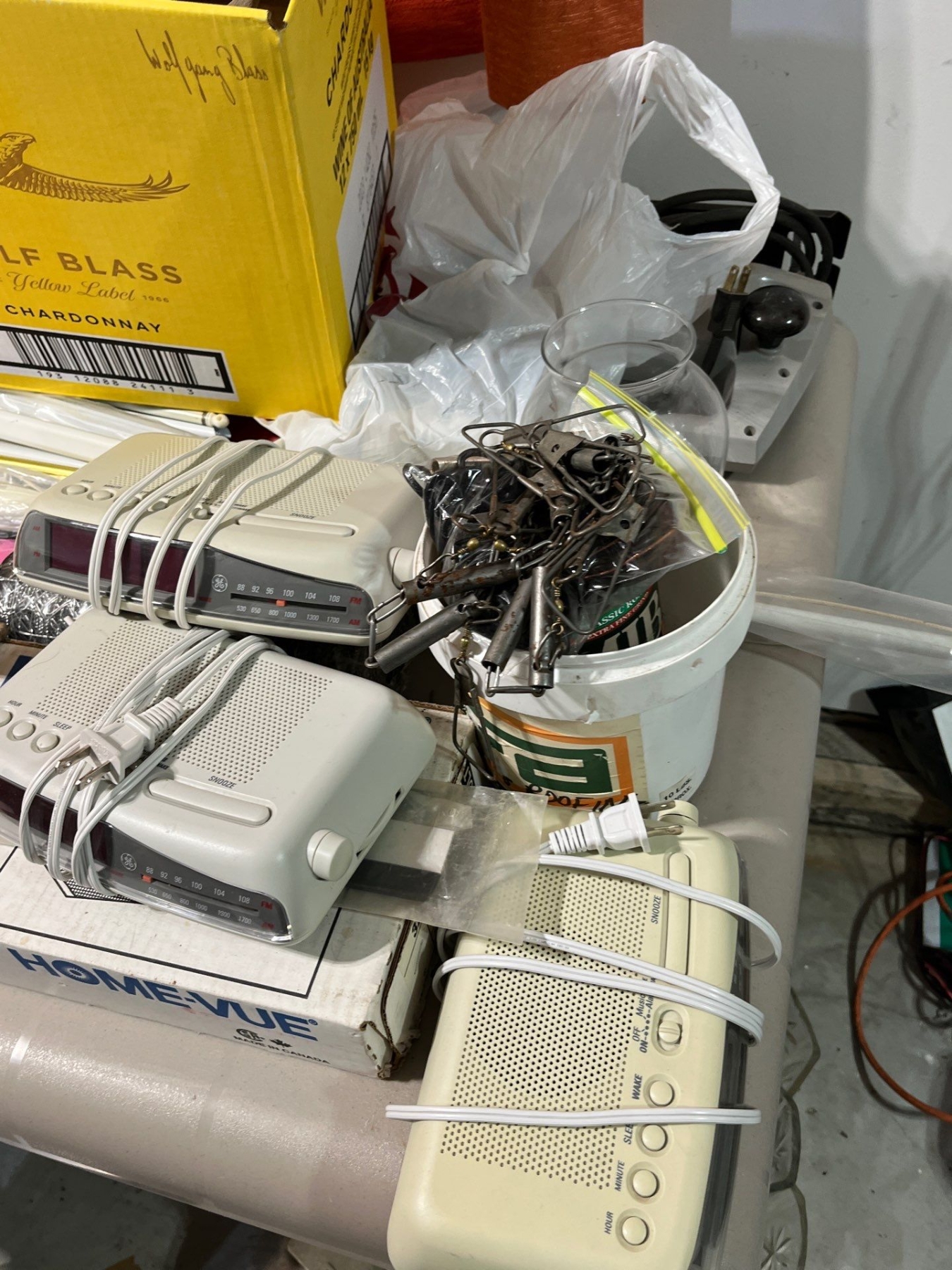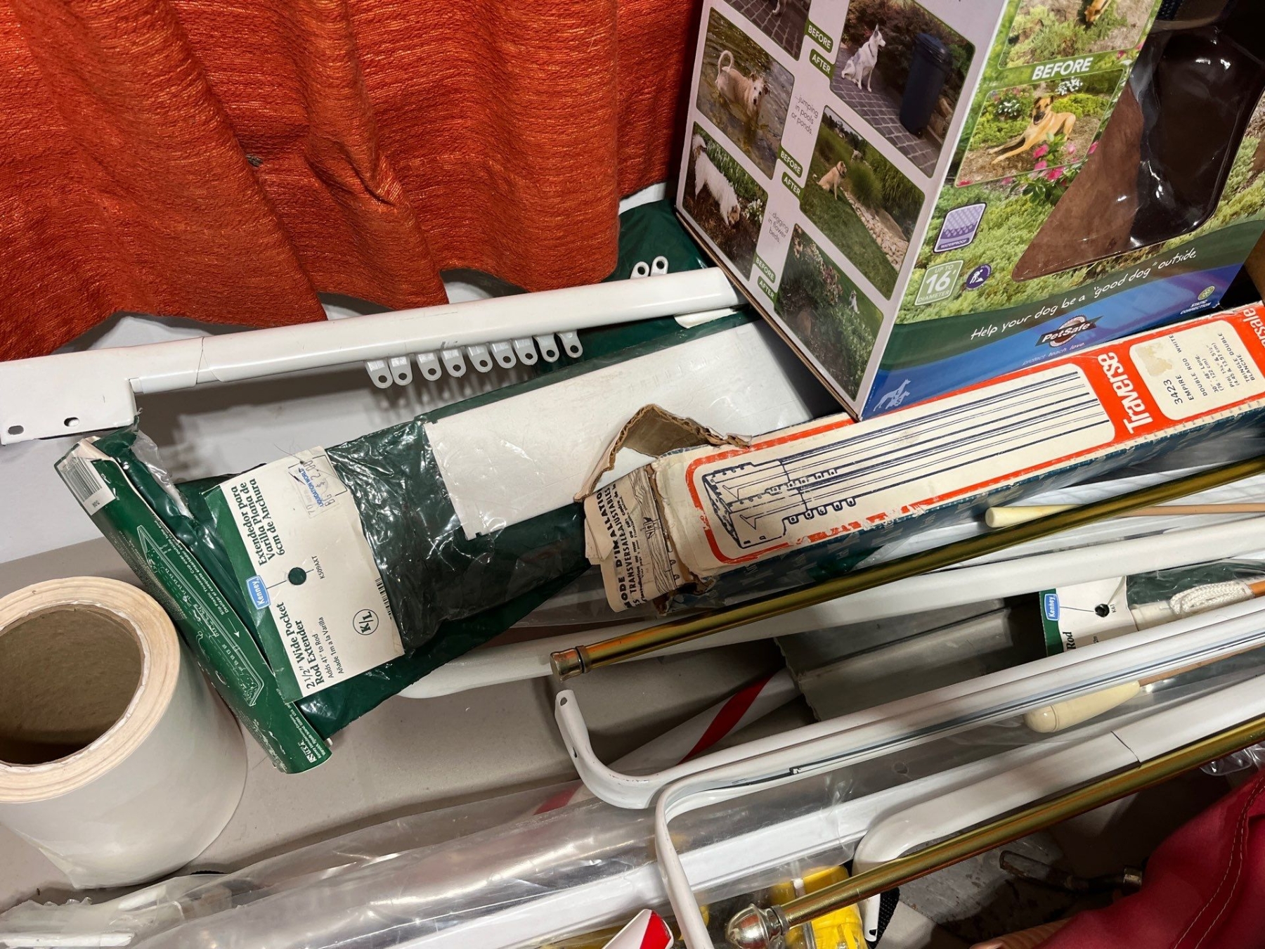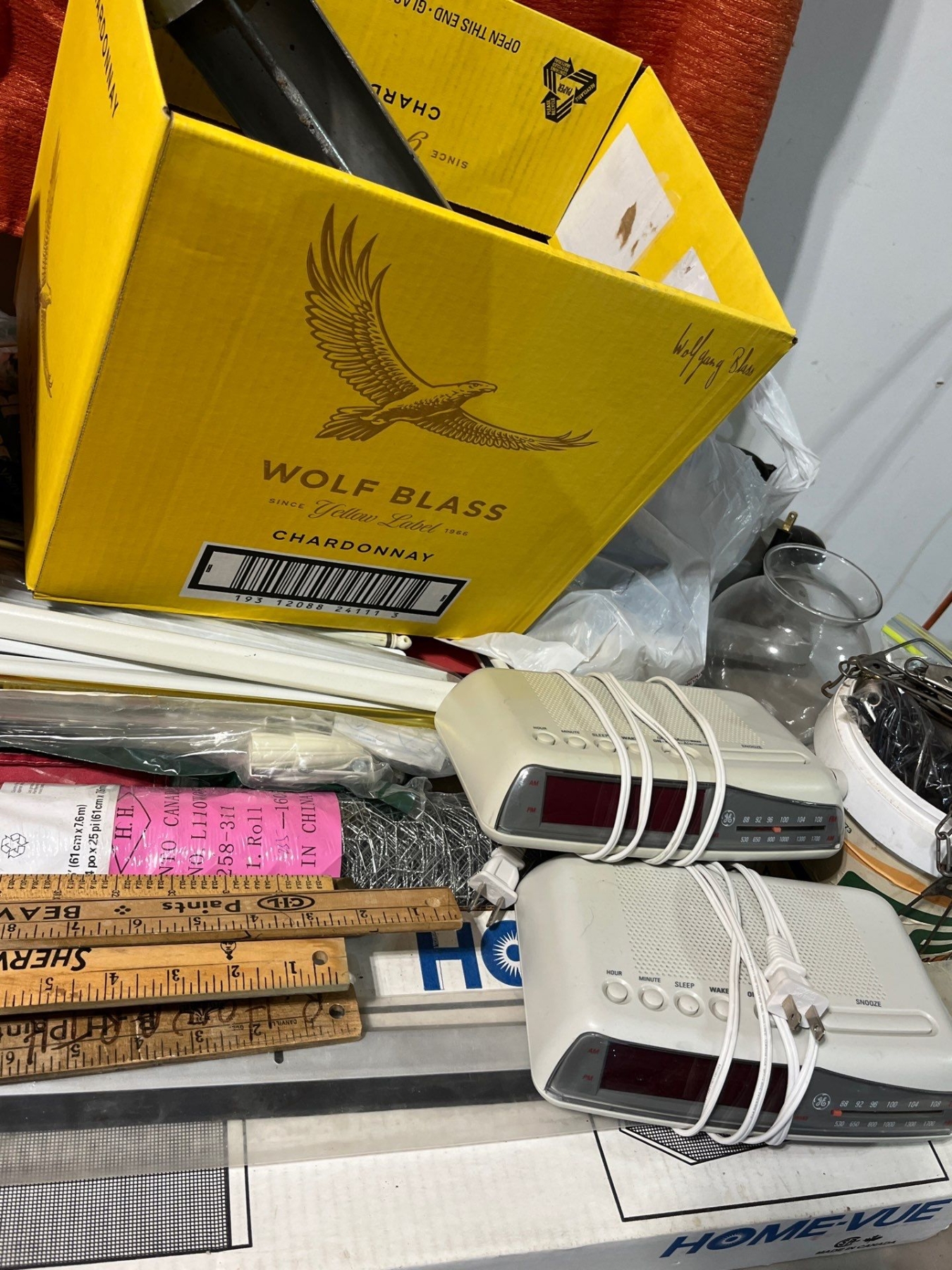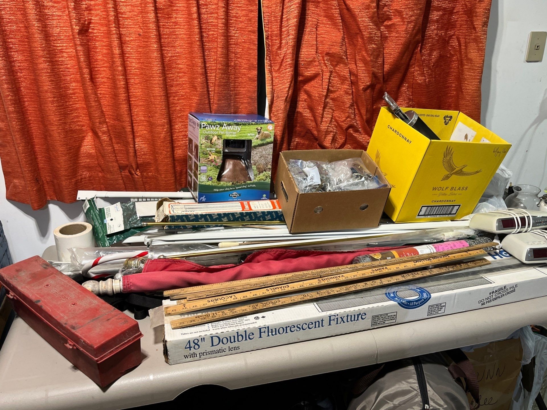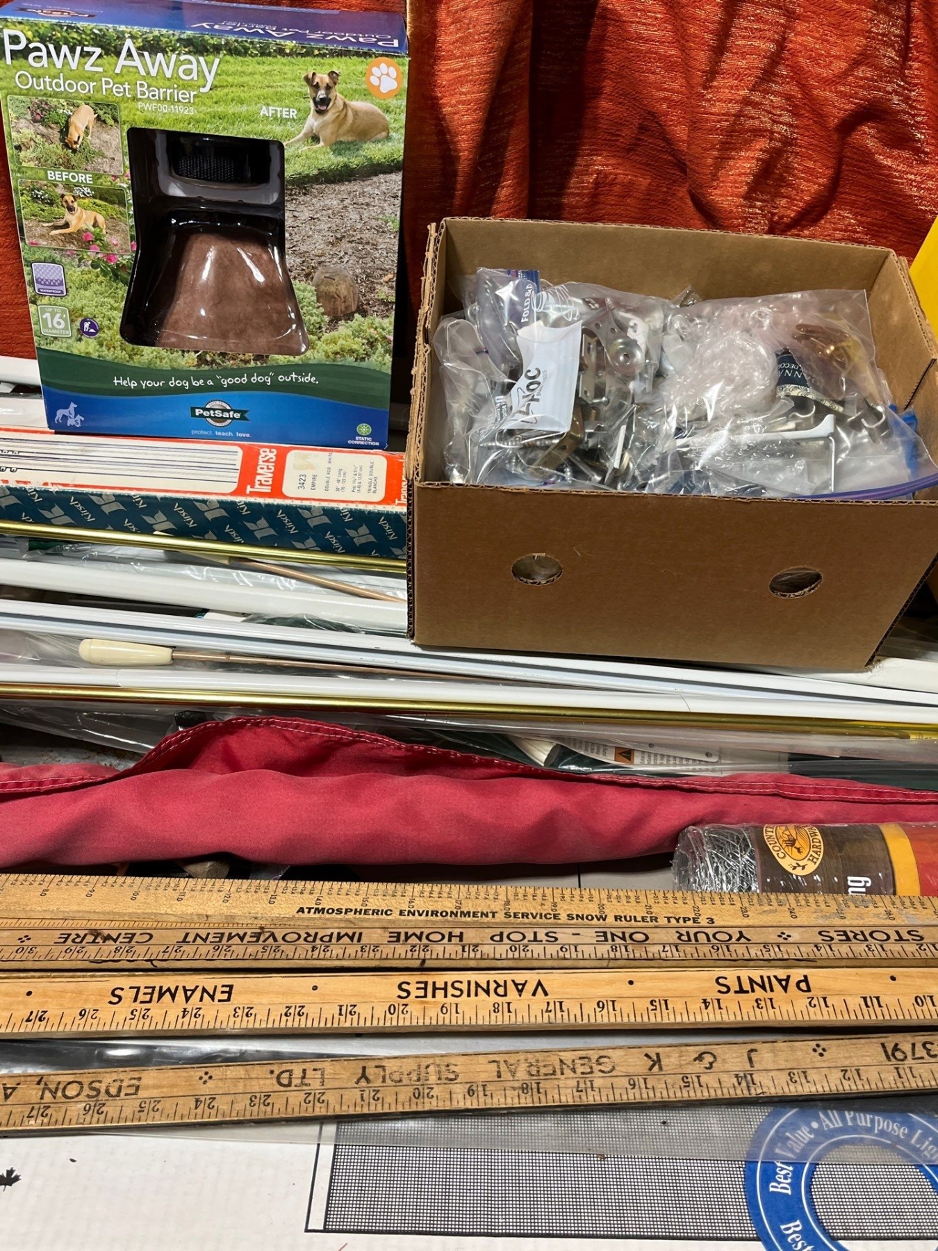 all contents of table, including several vintage meter sticks, put away outdoor pet barrier, huge just sort of meant of blinds and hardware, electric clocks and a big Canadian flag chicken wire and all sorts of goodies and attachments for your enjoyment