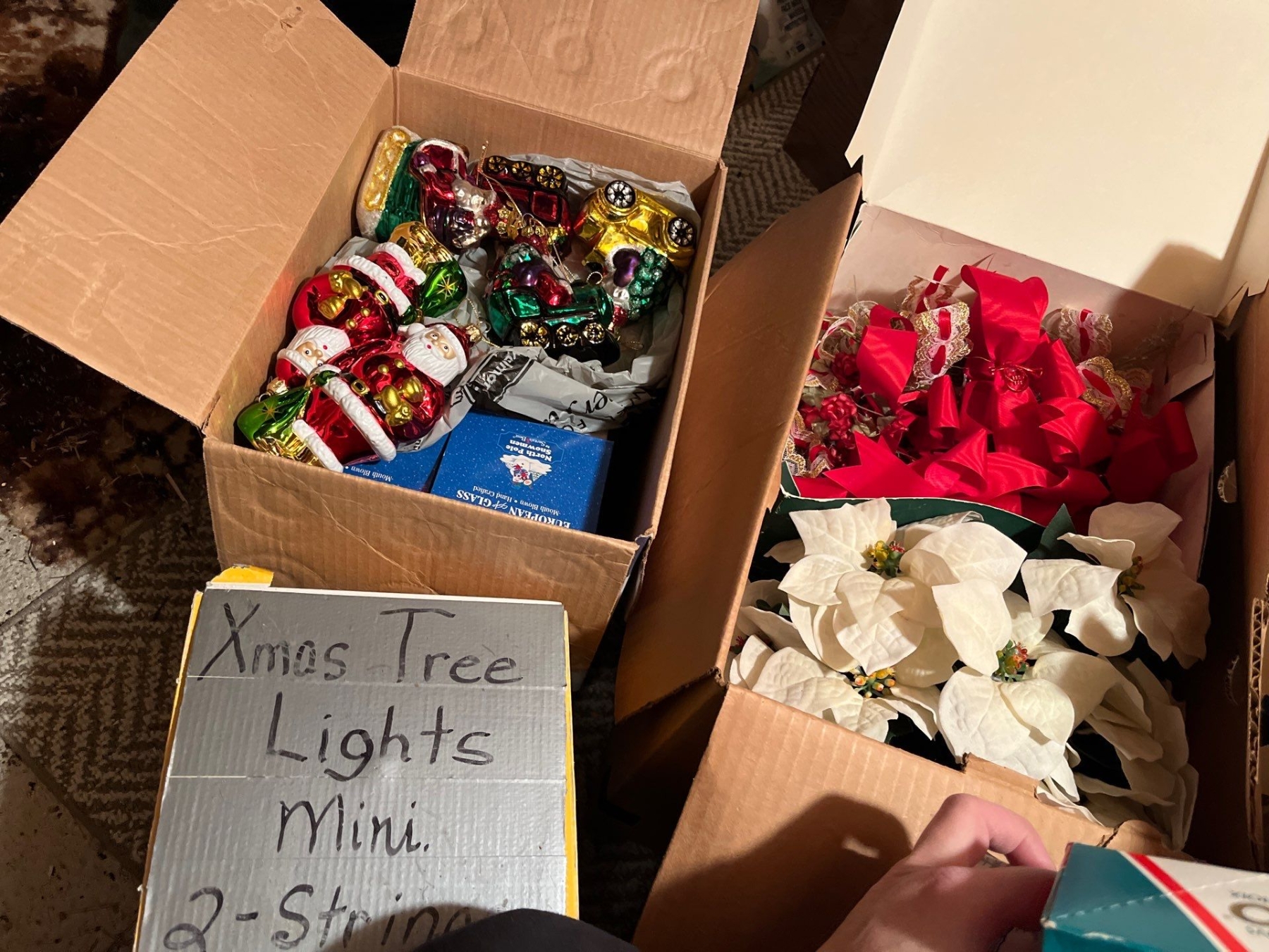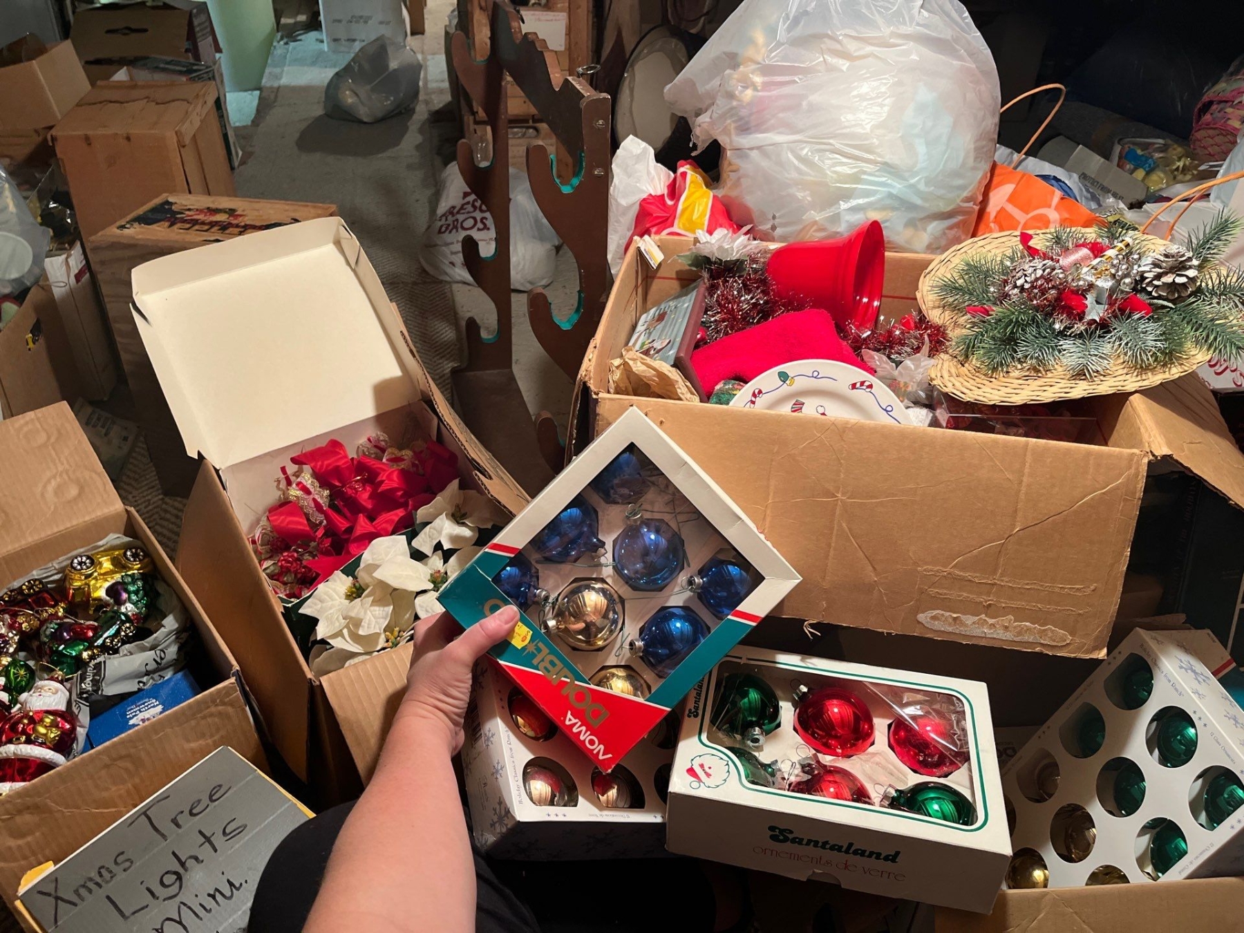 amazing collection of glass Christmas ornaments, Norma double glow fine quality, decorations, vintage red Christmas bows and poinsettias unopened Christmas decorations, and two sets of mini vintage strings of lights