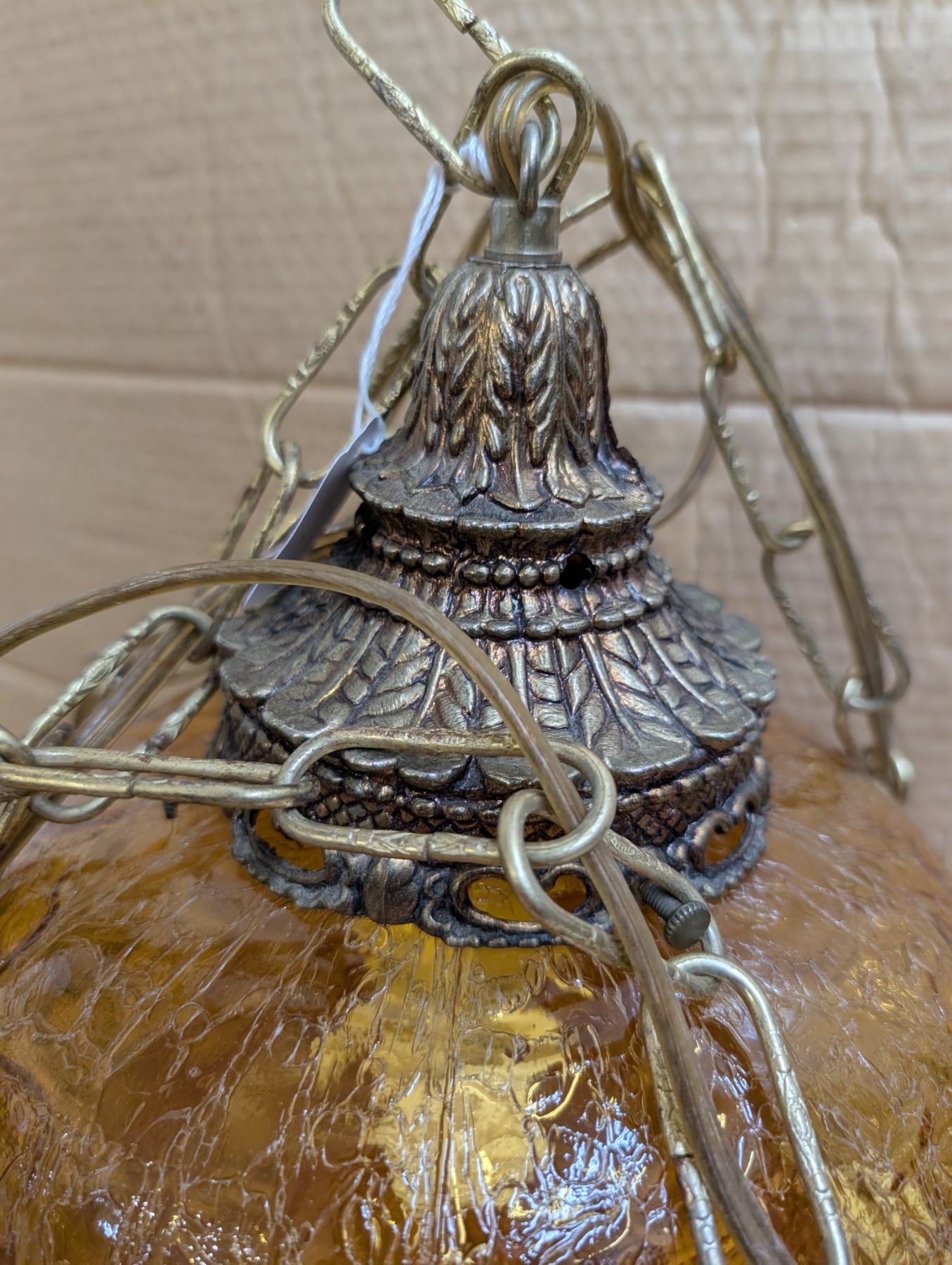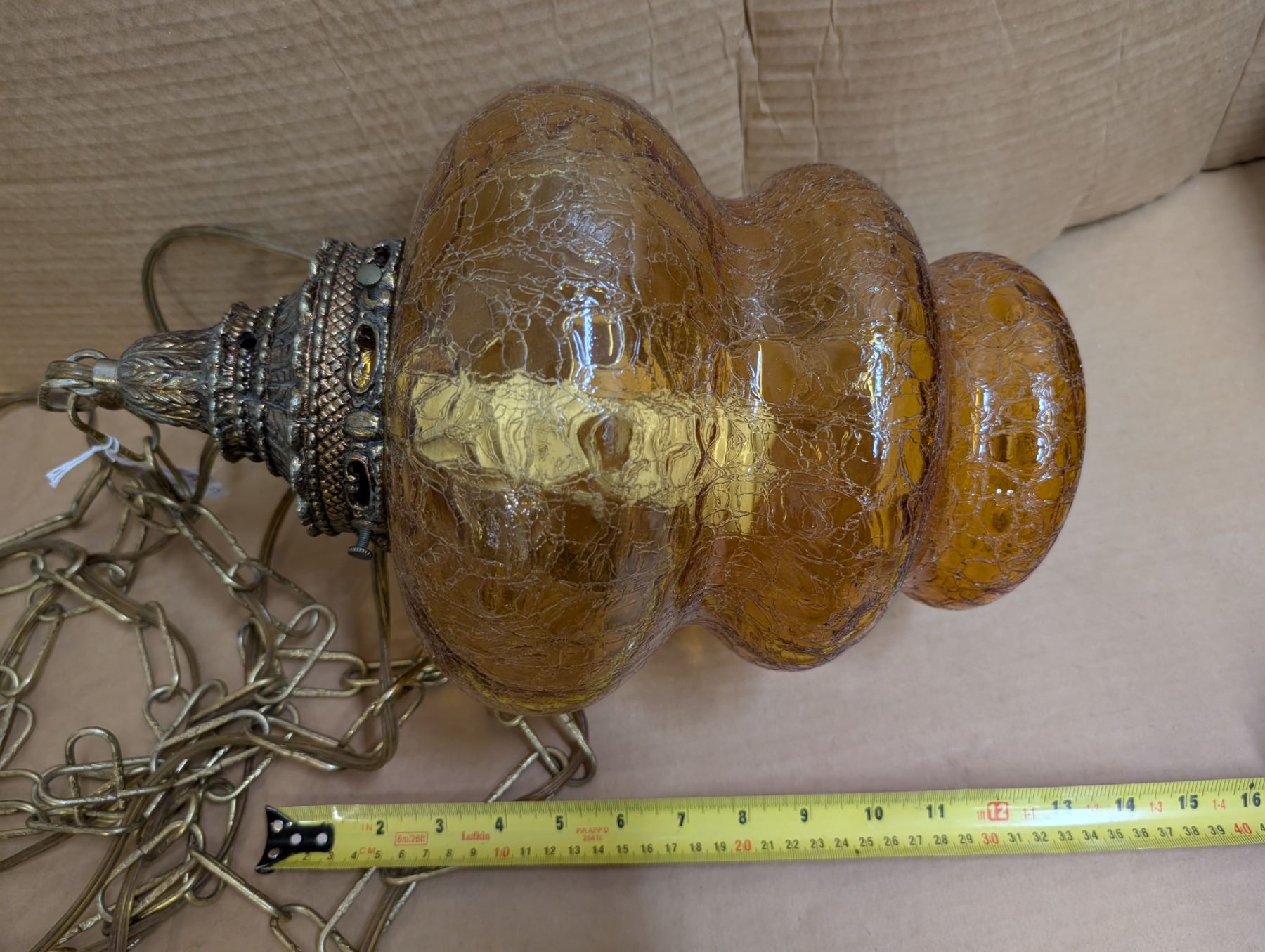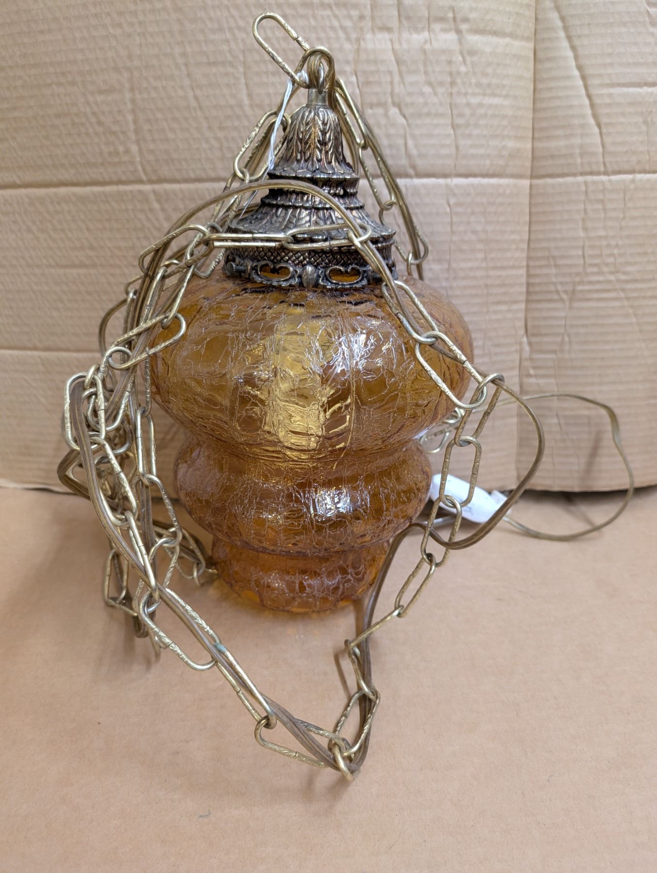 amber MCM crackle glass swag lamp - works, new switch