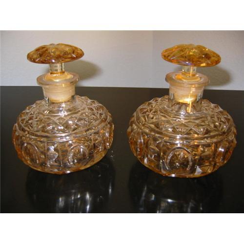 </font></strong>delightful and magnificent pr. of cut glass vintage decanters. each 5 inch tall, 4 " in diameter. in excellent condition. decorative and collectible with gorgious amber /champagne color. lids are each 2.5 in diameter. they are wonderful and functional. </font>