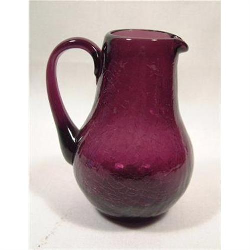 Crackle Glass miniature pitcher made by the Pilgrim Glass Company of West Virginia. This company went out of business about five years ago, and their pieces are even more collectible today. This particular miniature pitcher is in exquisite amethyst colored, deep, rich in color. It has very fine crackling and the pitcher is all hand blown. It is 3 3/4" tall. No damage. (free crackle glass book to the lucky winner. You just pay a little extra for shipping. Please remind me of this free offer)