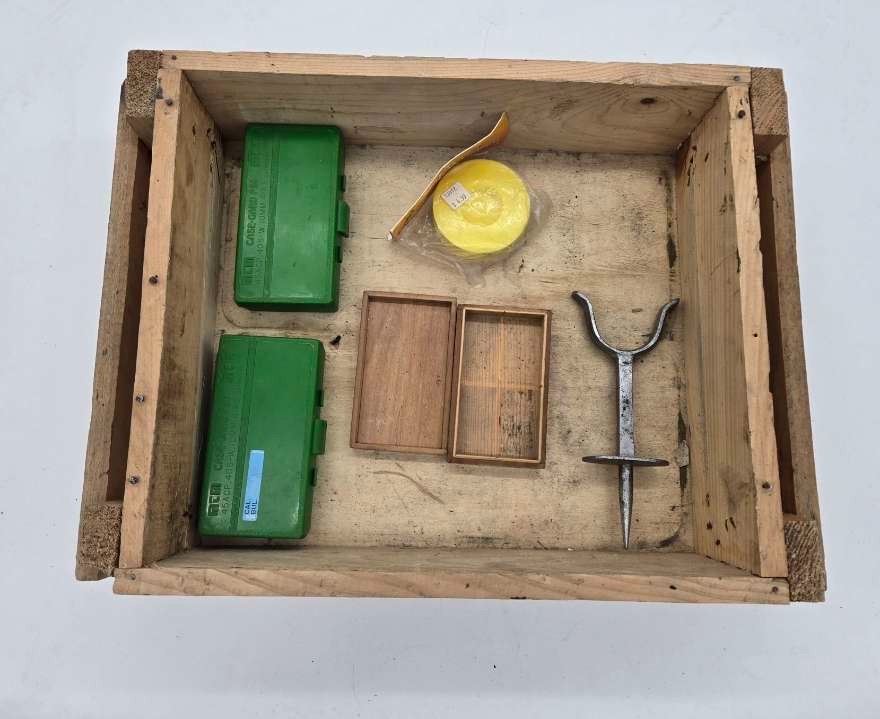 2 shell holders, fishing marker system, small wood box , shooting rest