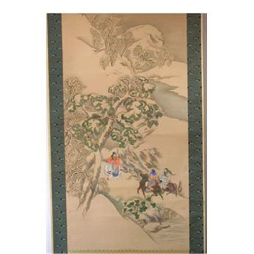 ANTIQUE JAPANESE SCROLL--ART IS 51" LONG--OVERALL LENGTH IS 80"--THE PAINTING IS MOUNTED ON A CLOTH BACKING--THE STORY IS ABOUT THE EMPORER MEETING WITH CHU-KO-KUNG-MING TO ASK FOR HIM TO JOIN AS SUPREME COMANDER OF THE EMPORER'S ARMY--THE PAINTING IS BY TASAKI SOUN,A FIRST RANKED ARTIST WHO HAD BEEN A SAMURAI WHEN YOUNG