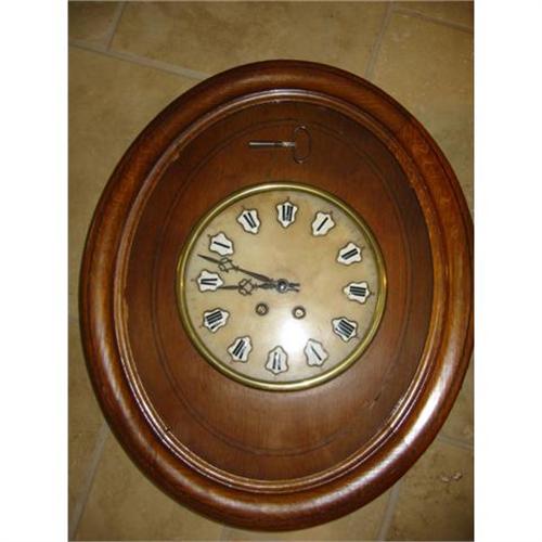 antique Vinyard french Oval wall clock walnut wood w porcelain roman numberal, its original key and superb quality. chimes repeat 2 minutes after the hour for prayer. it also chimes on the half hour. the porcelain numerals raised plaque edges in brass or bronze. 22 inches tall, x 18.5.excellent condition with normal wear and tear.