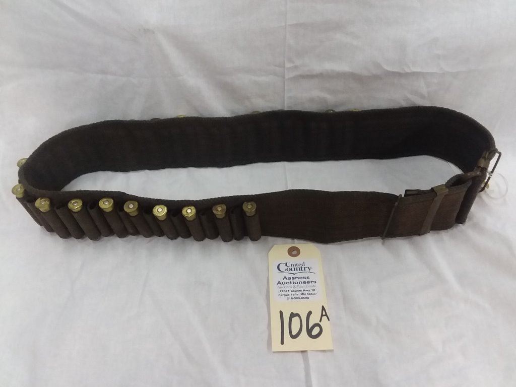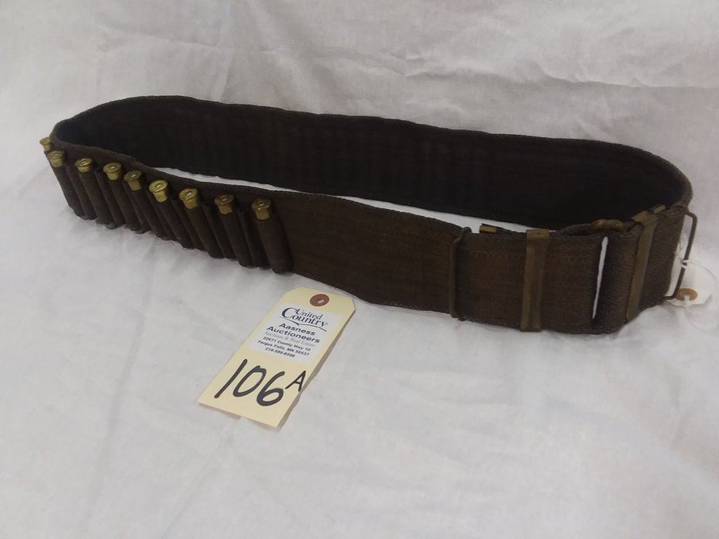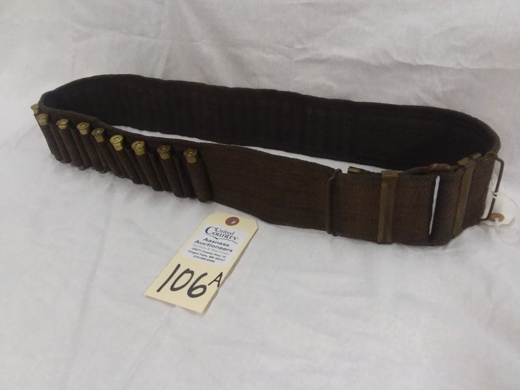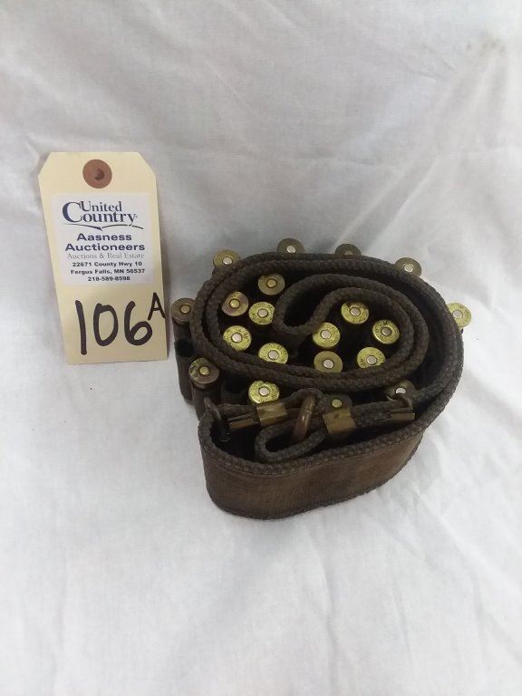 US 45-70 caliber blue 1880s military Mills woven ammo belt with C closer and 20 rounds of 45-70 UMC ammunition