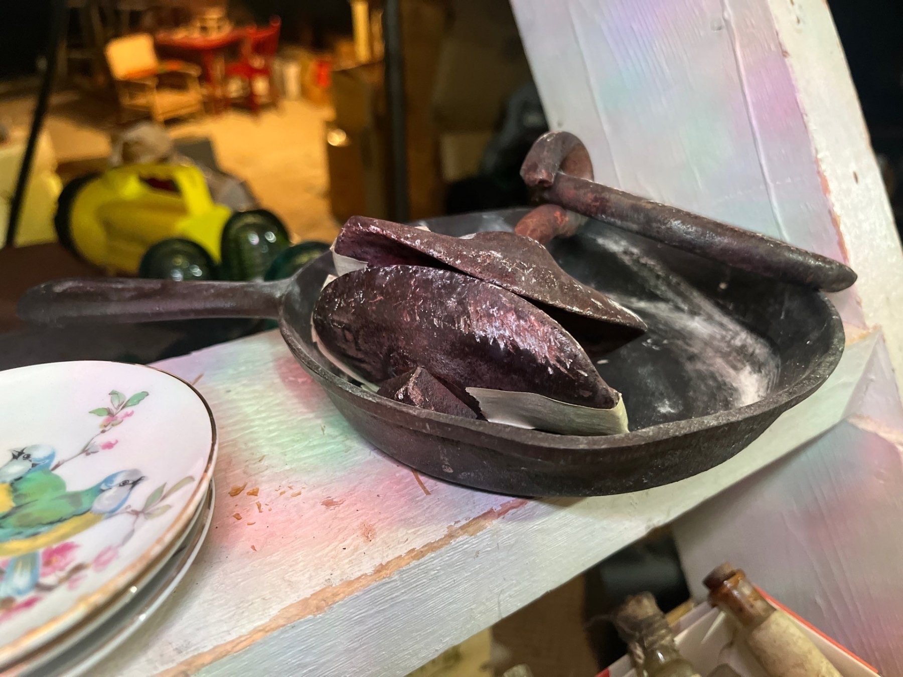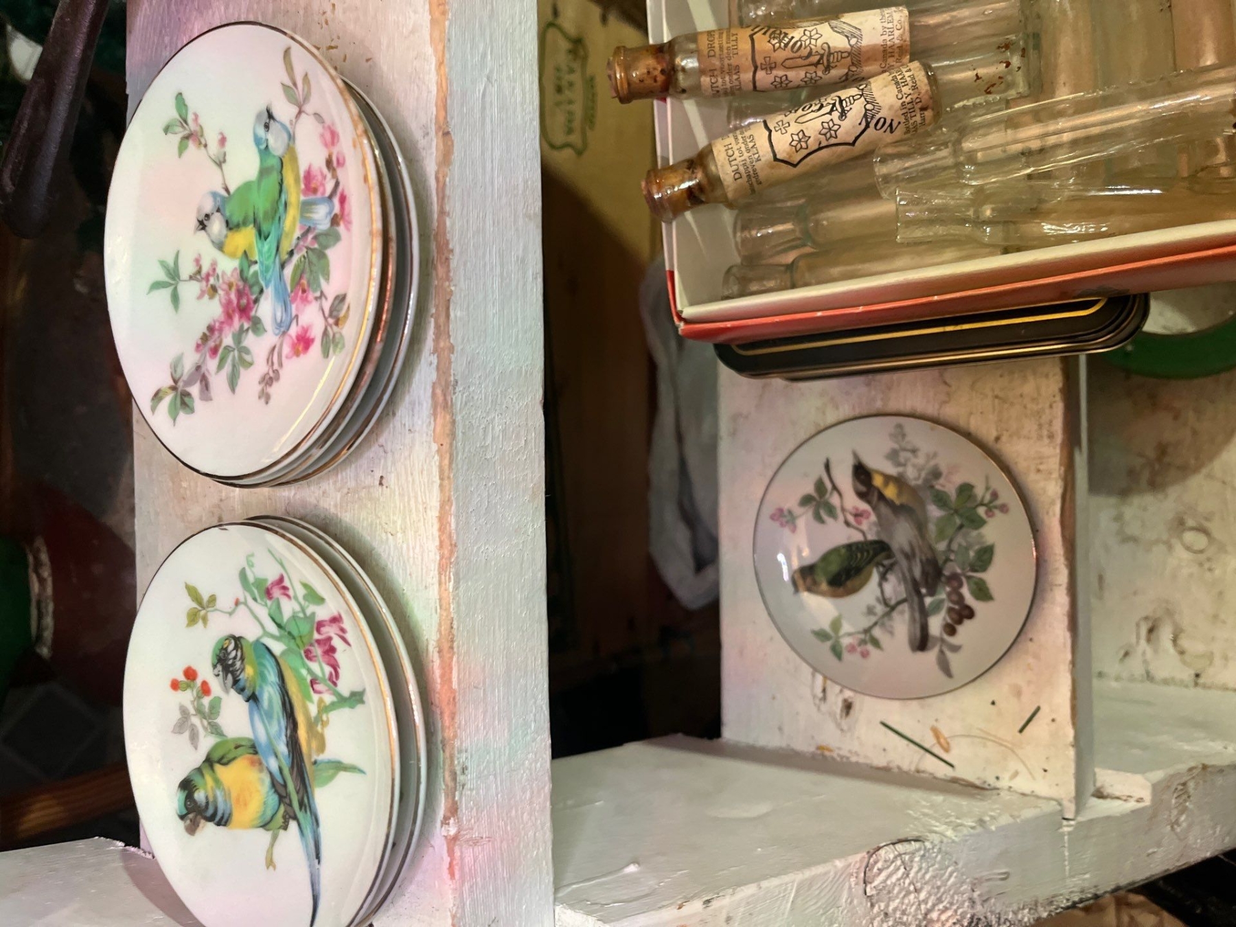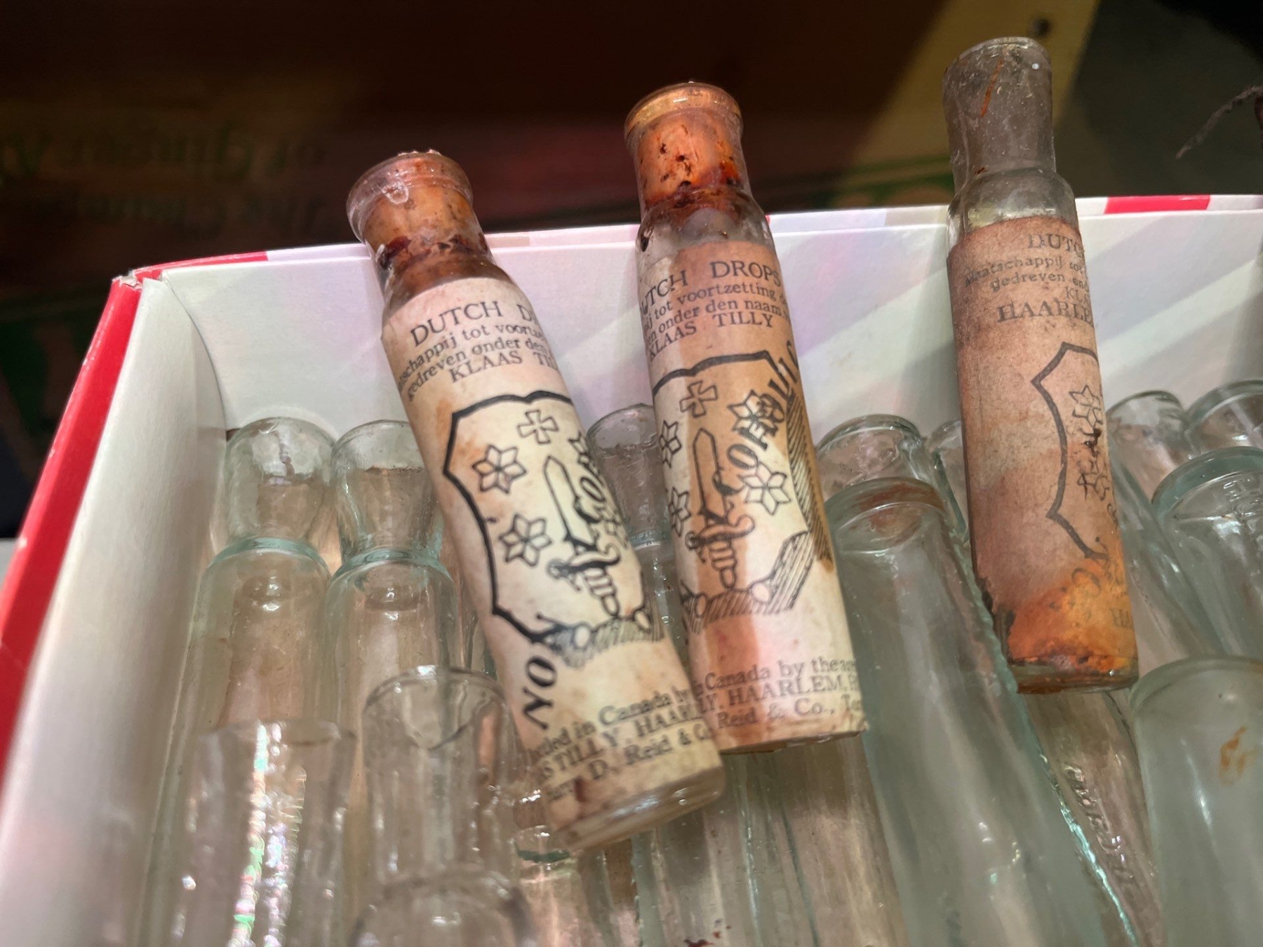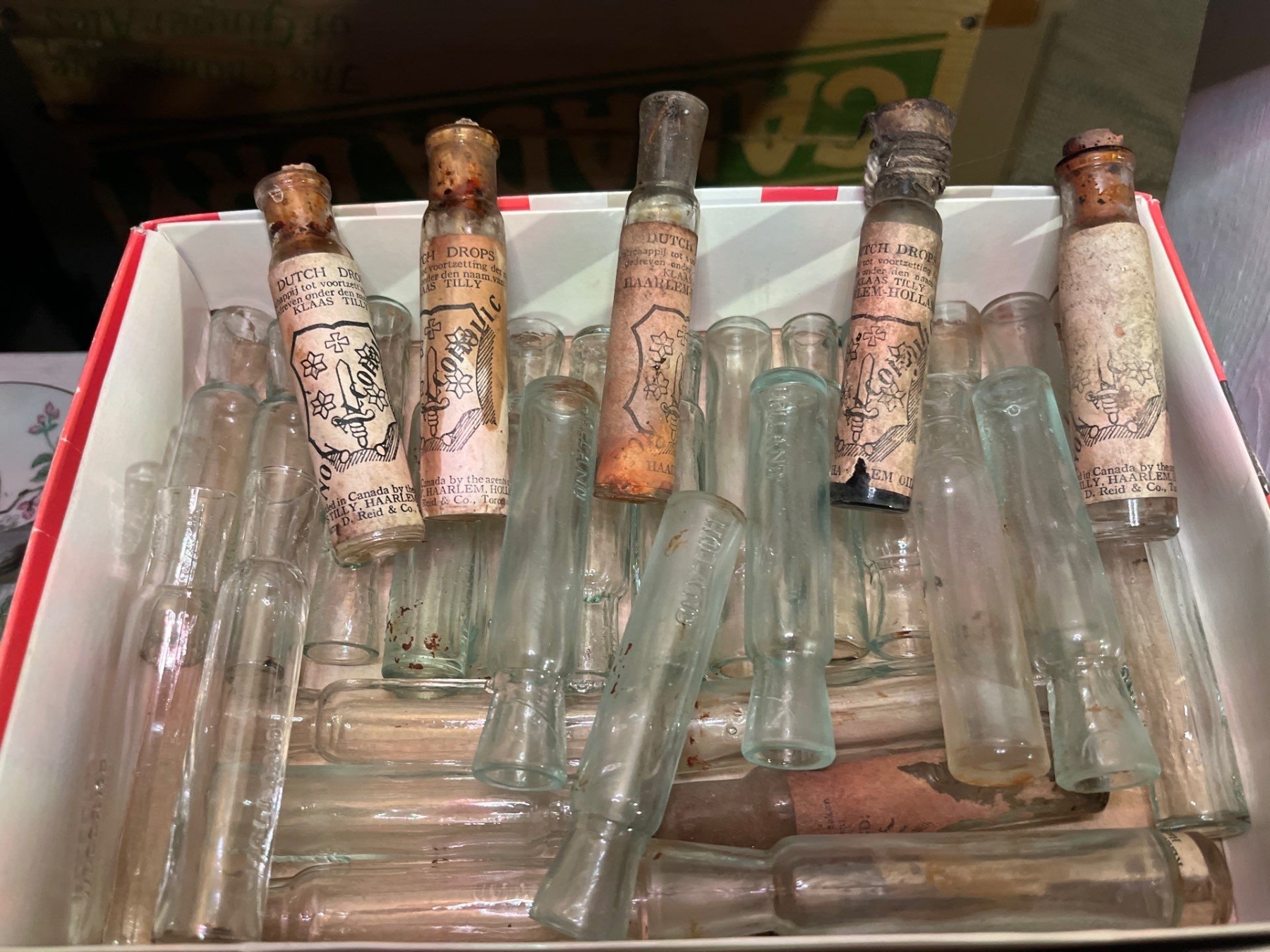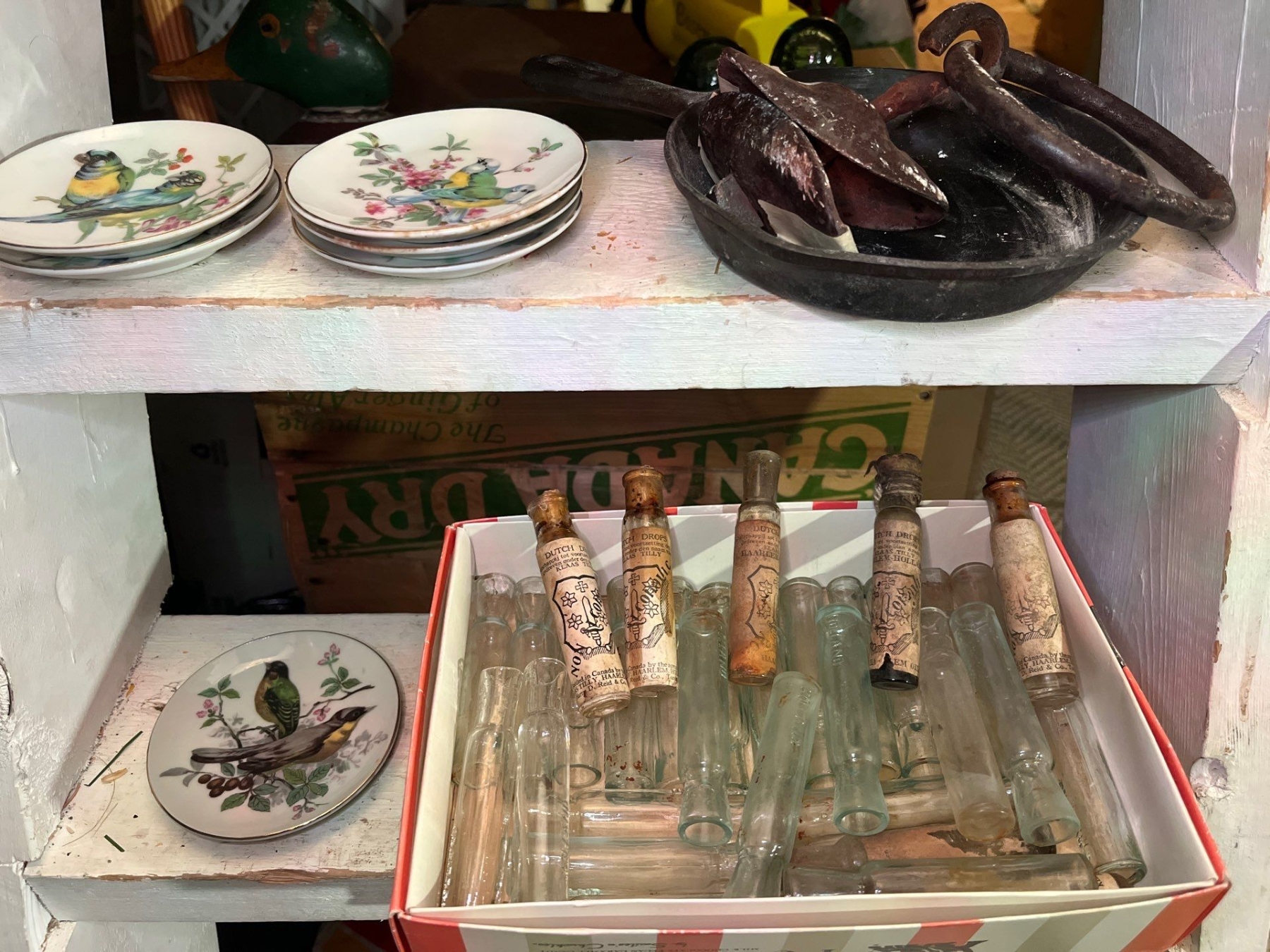 approximately 31 mini bottles. Dutch drops. Bottled in Canada by the agents of KLAAS Tilly, Harlem Holland, Harry D Raianne Company Toronto. Mini cast-iron pan And a collection of mini bird plates.