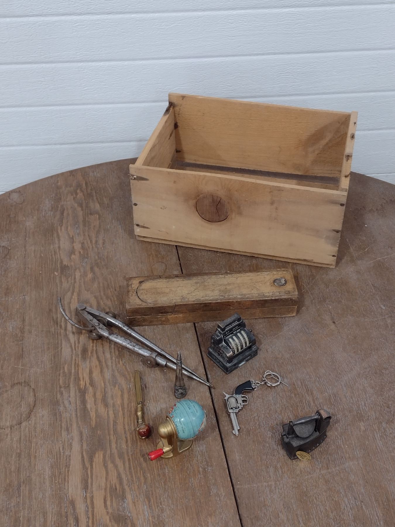 assorted desk items with wooden crate