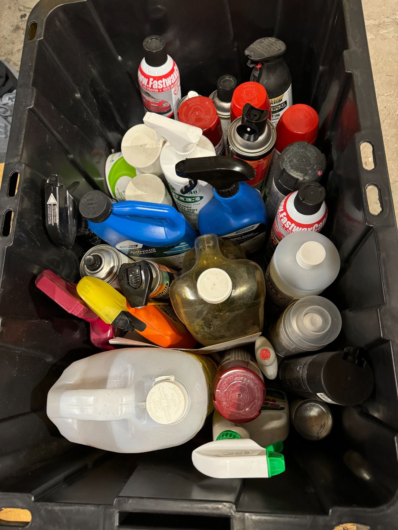 assorted, garage fluids with bin and lid
