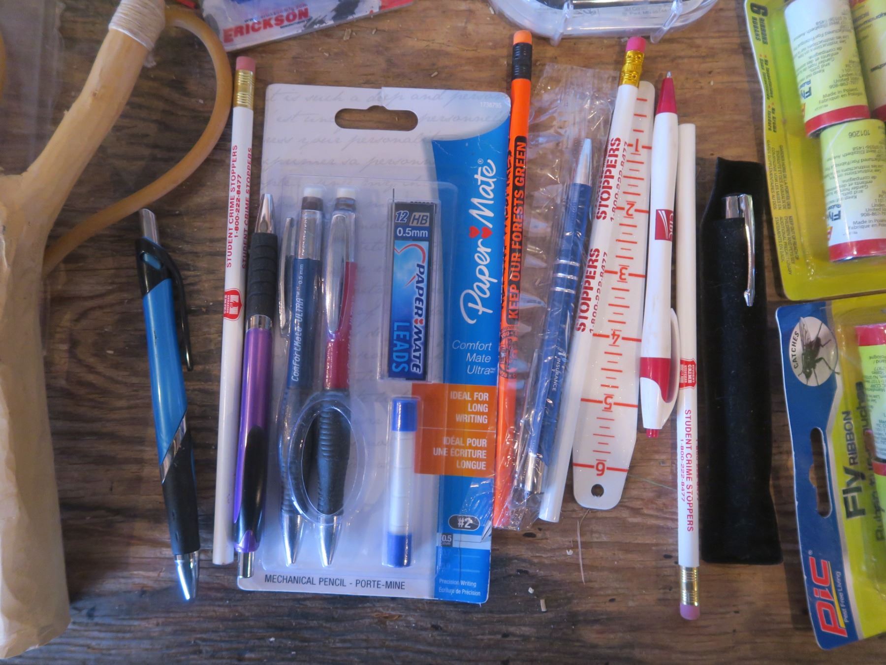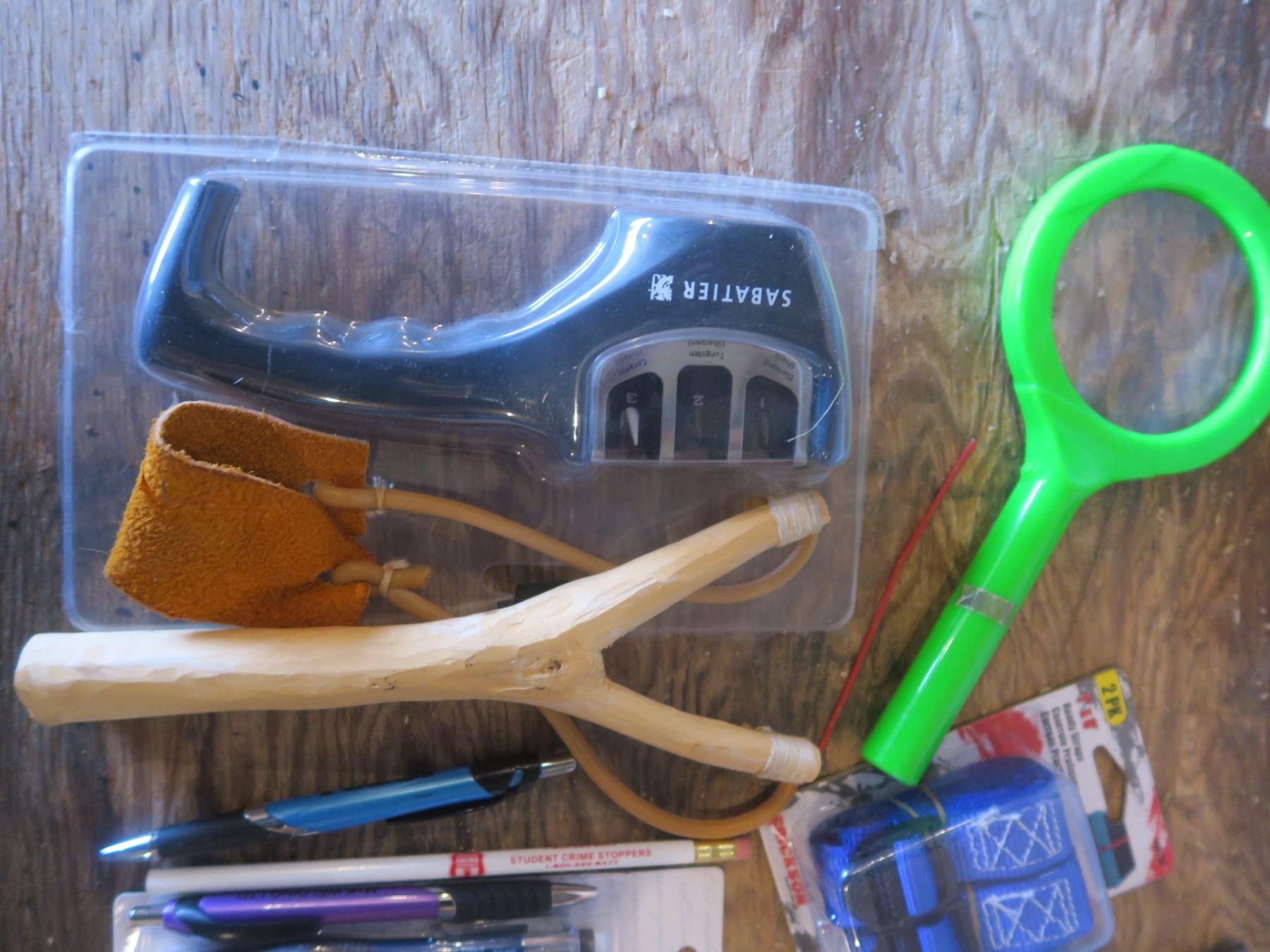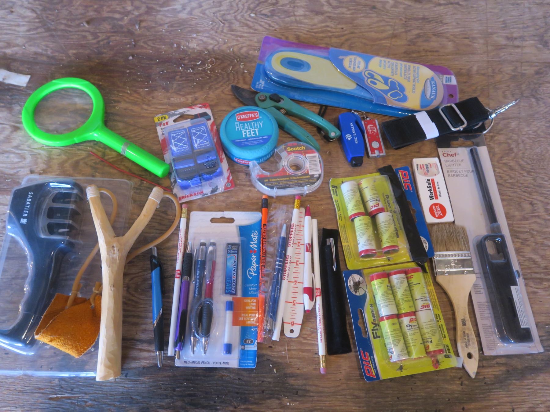 assorted lot - knife sharpener, slingshot, pens, fly traps, etc.