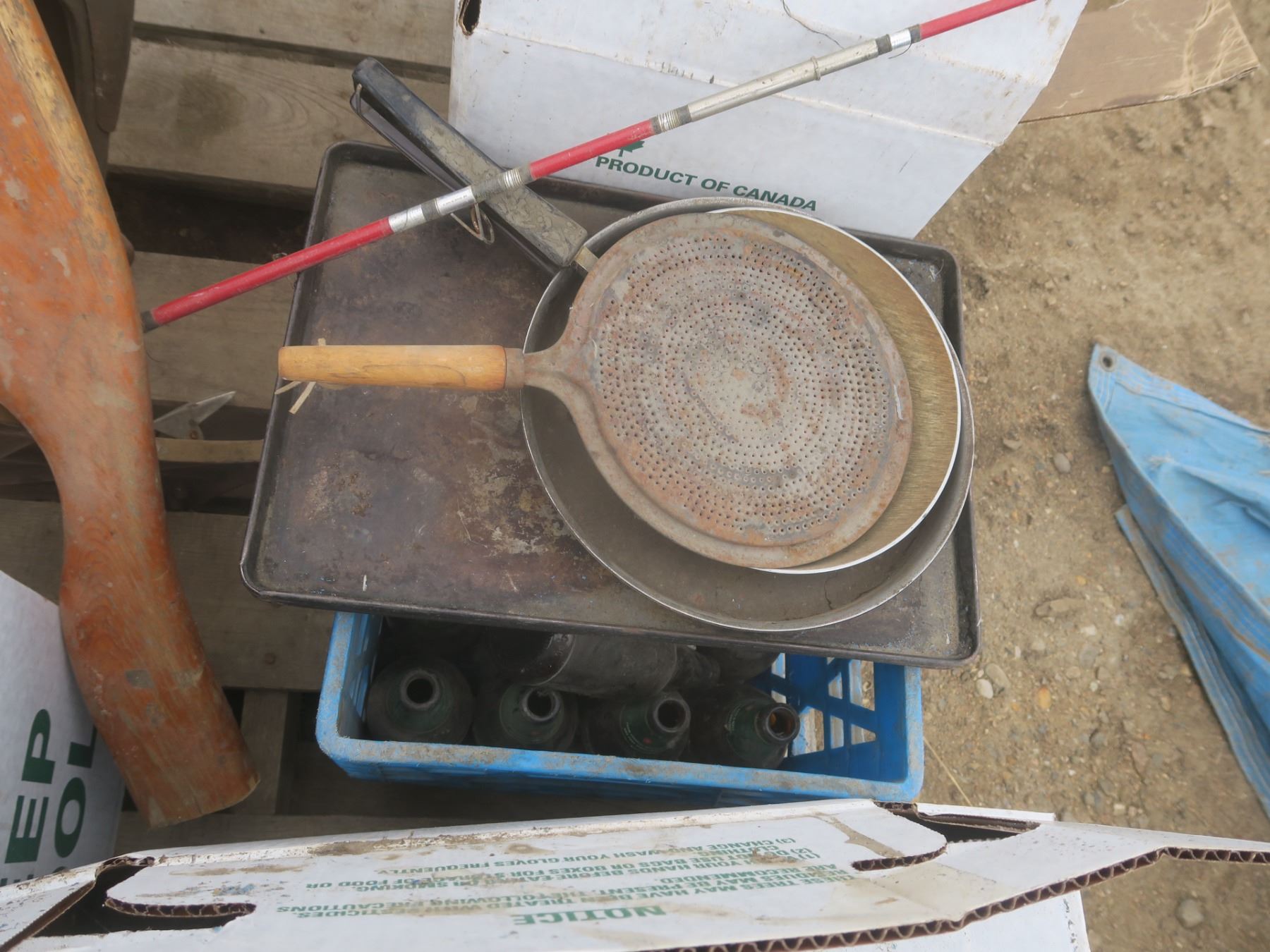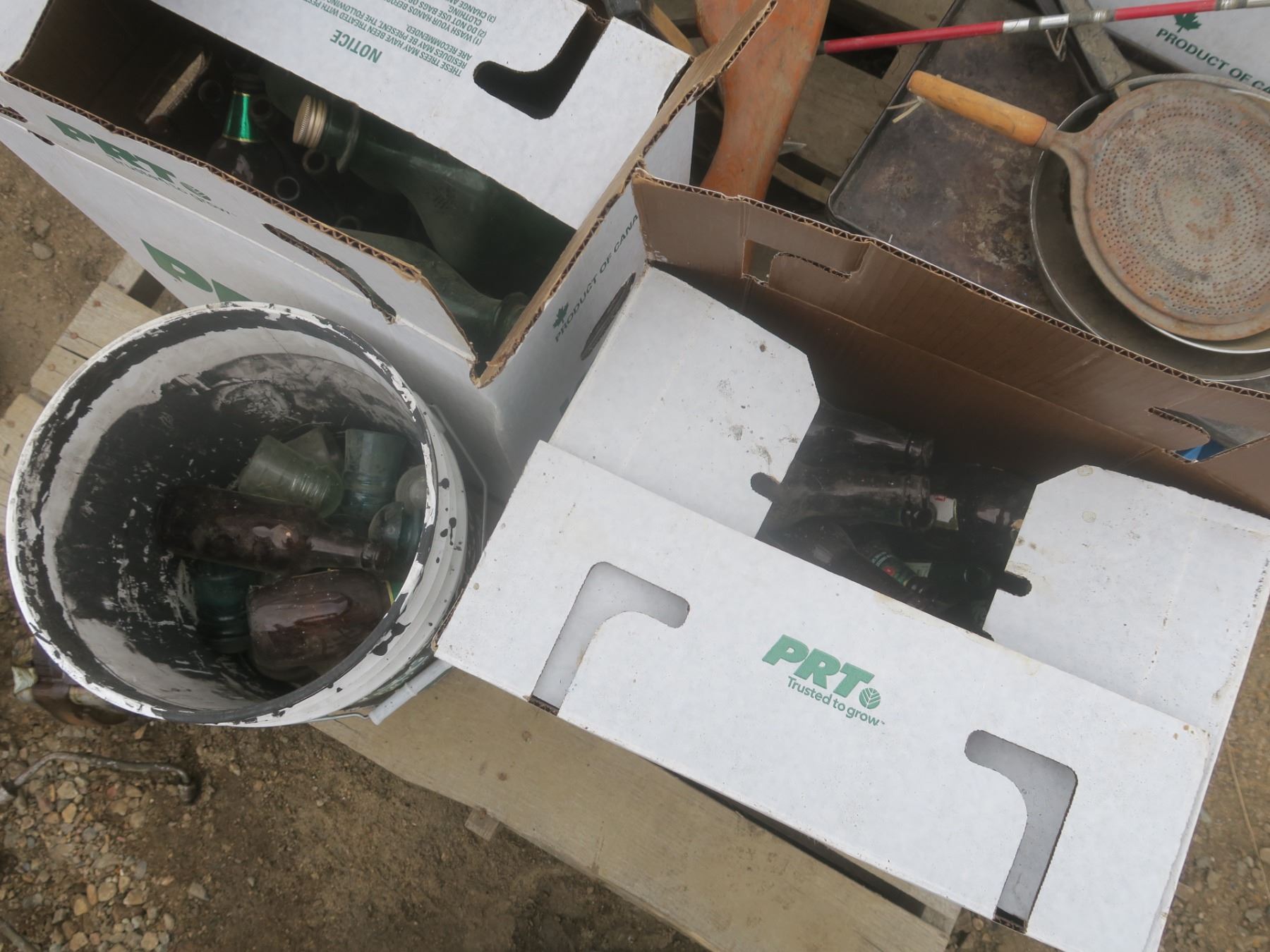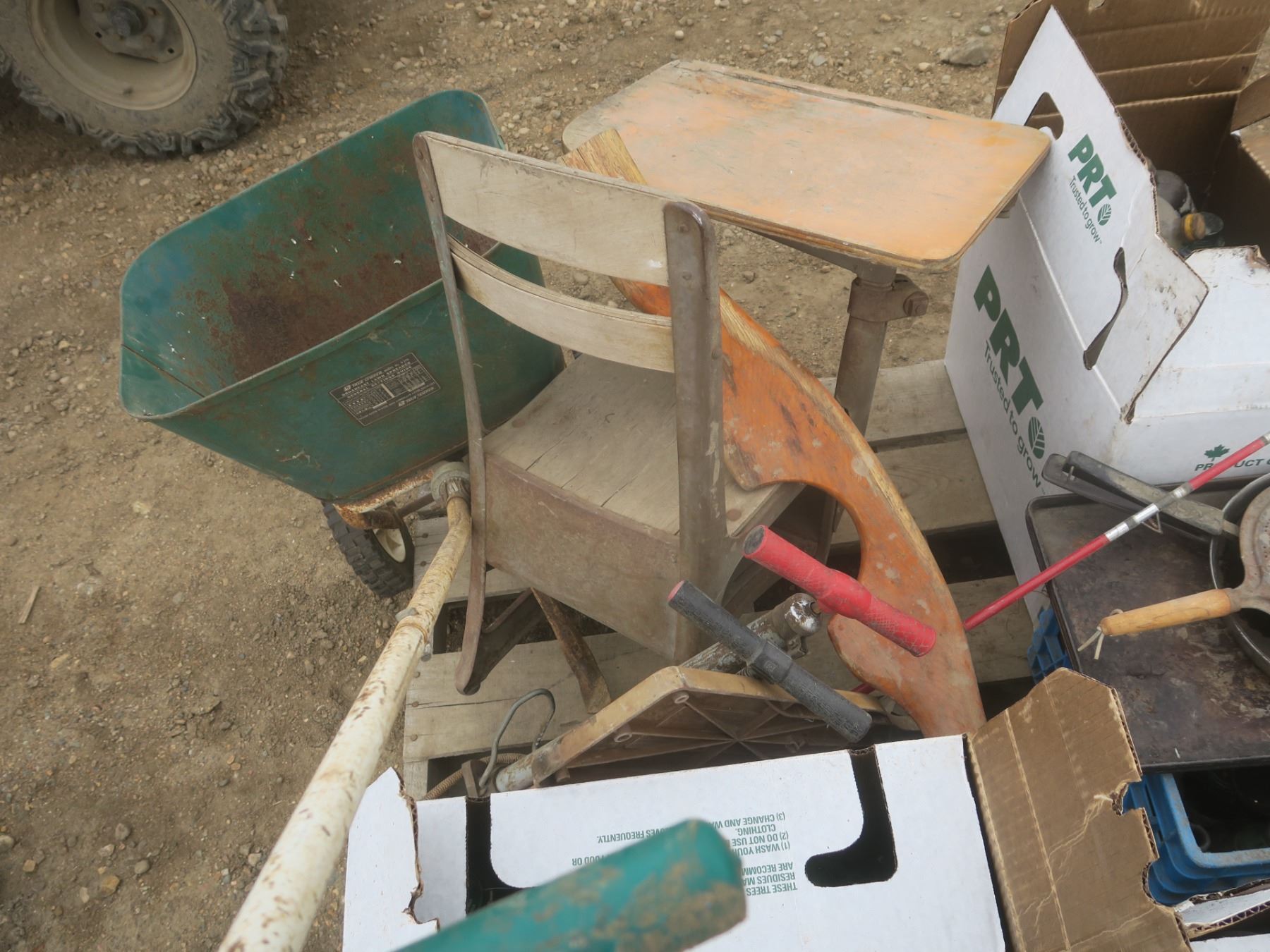 assorted pallet - bottles, school desk, fishing rod, etc.