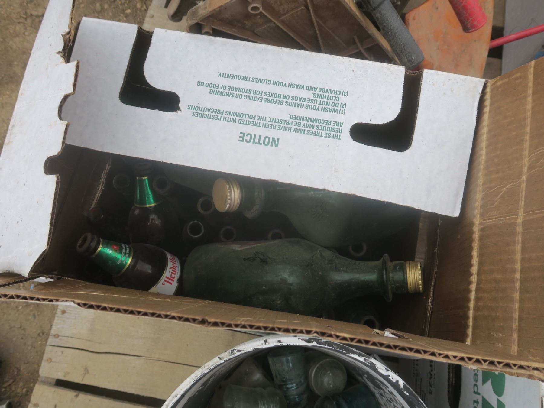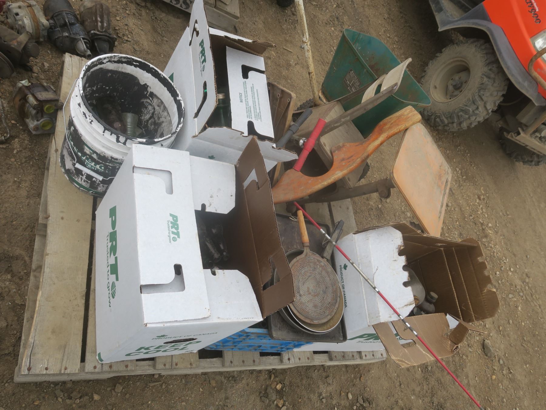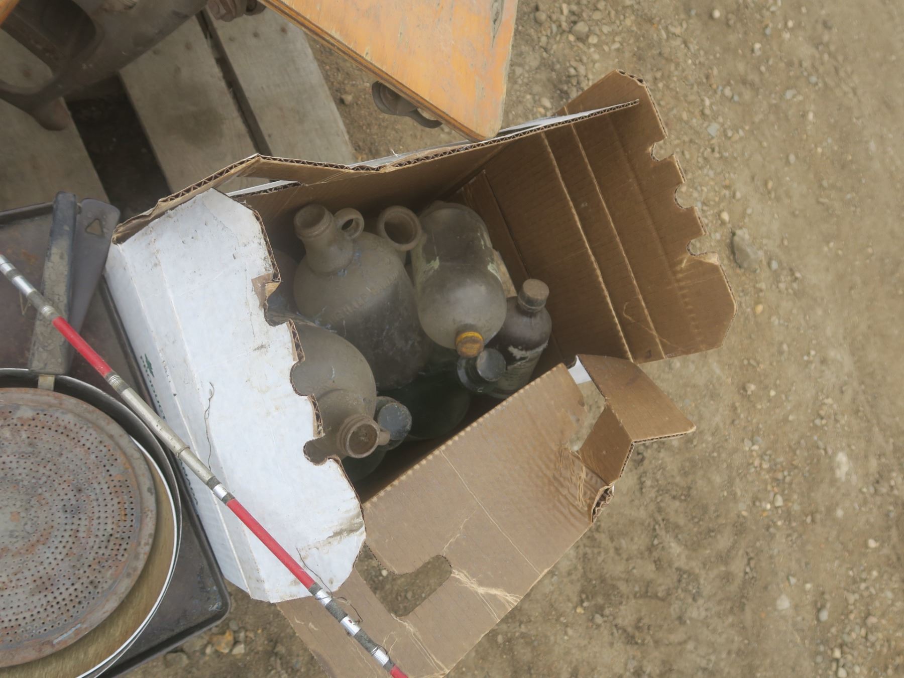 assorted pallet - bottles, school desk, fishing rod, etc.