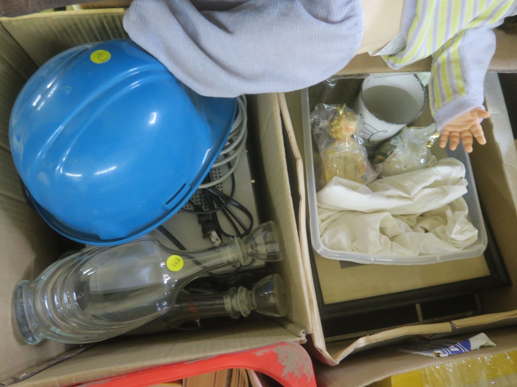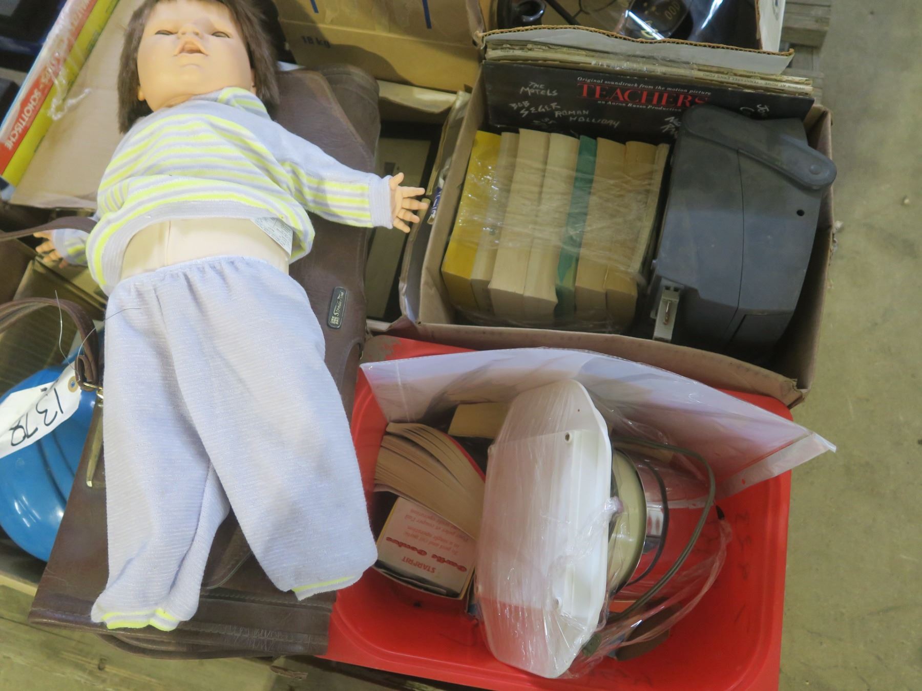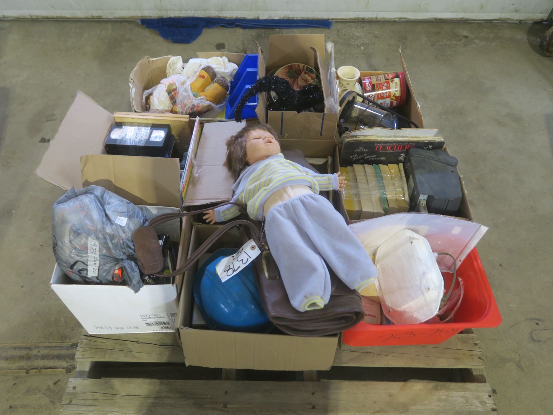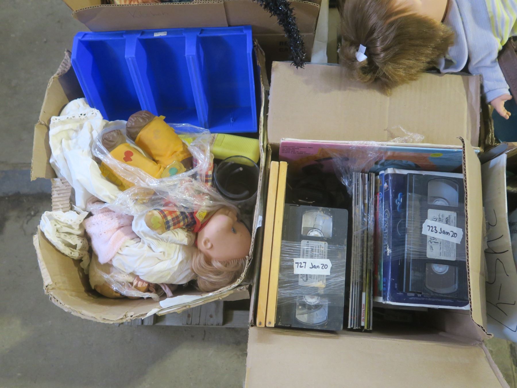 assorted pallet - dolls, jars, vhs tapes, tins, etc.