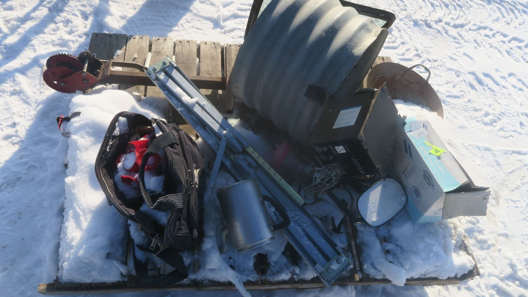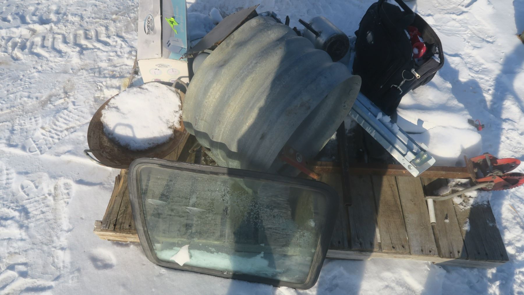 assorted pallet including jack, window, culvert piece, etc.