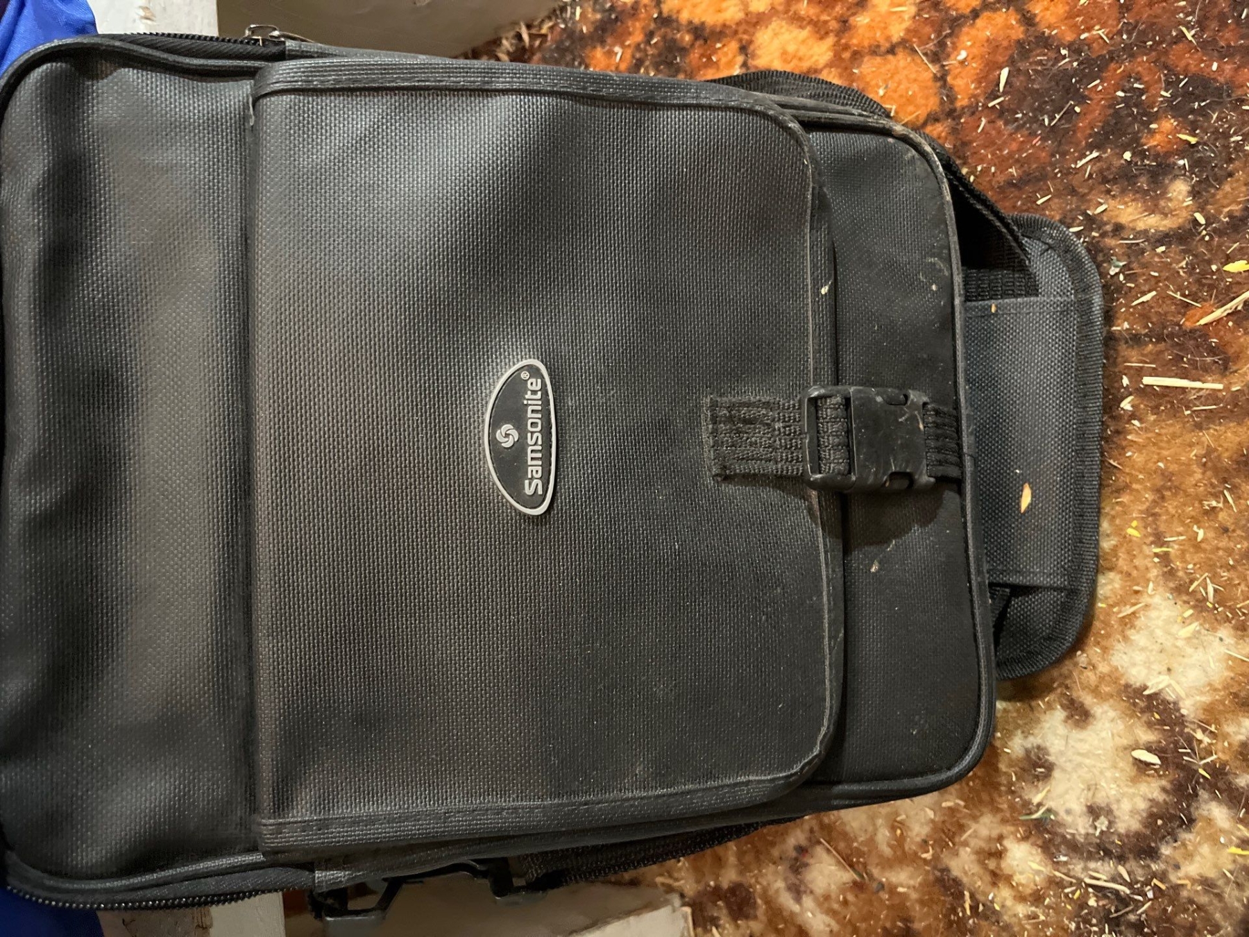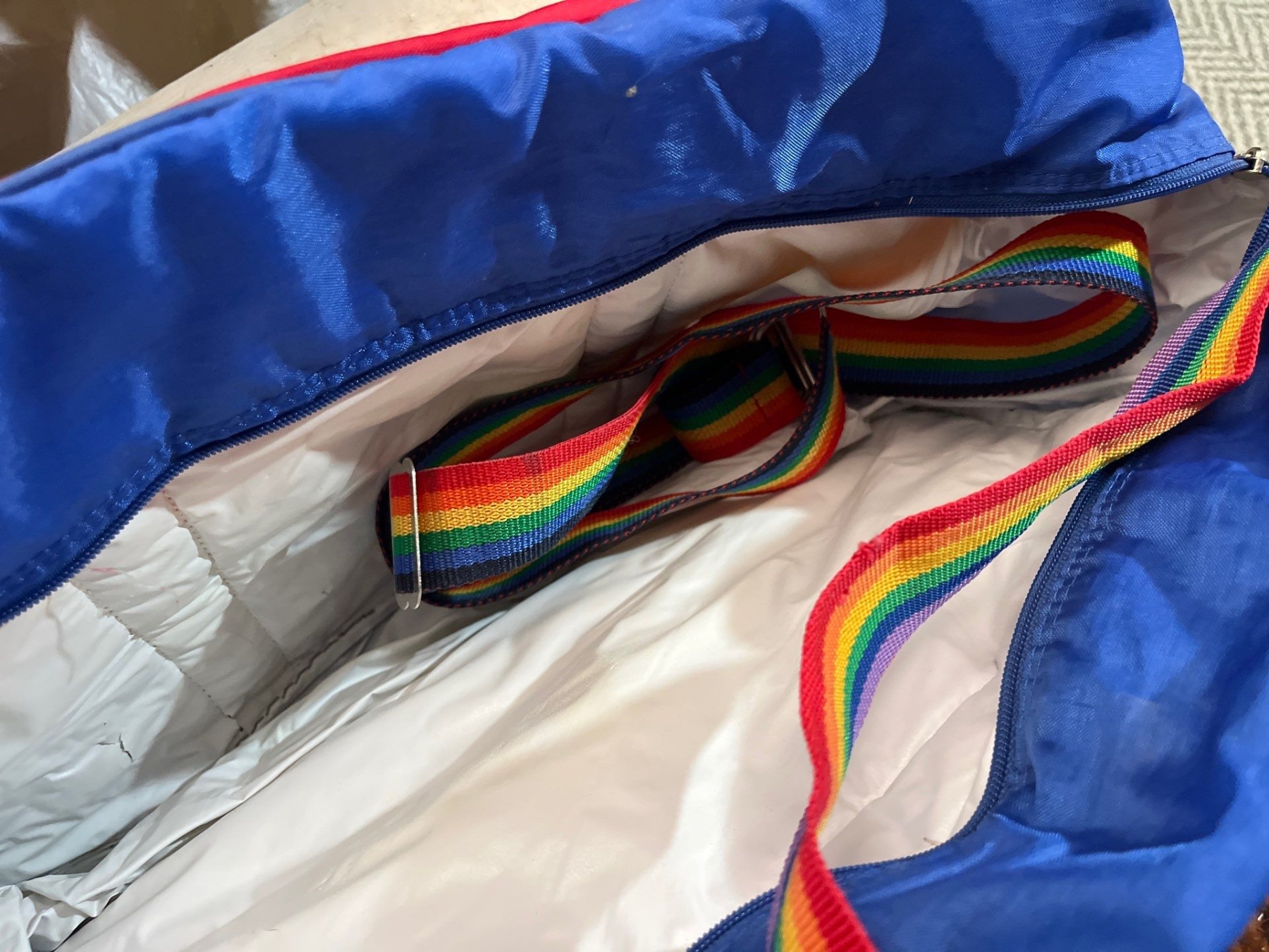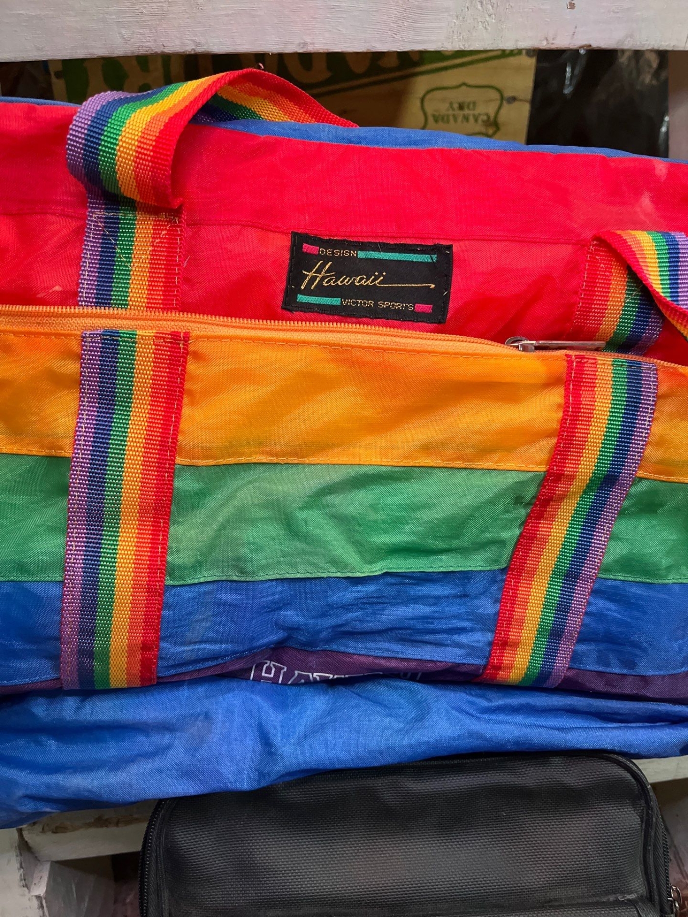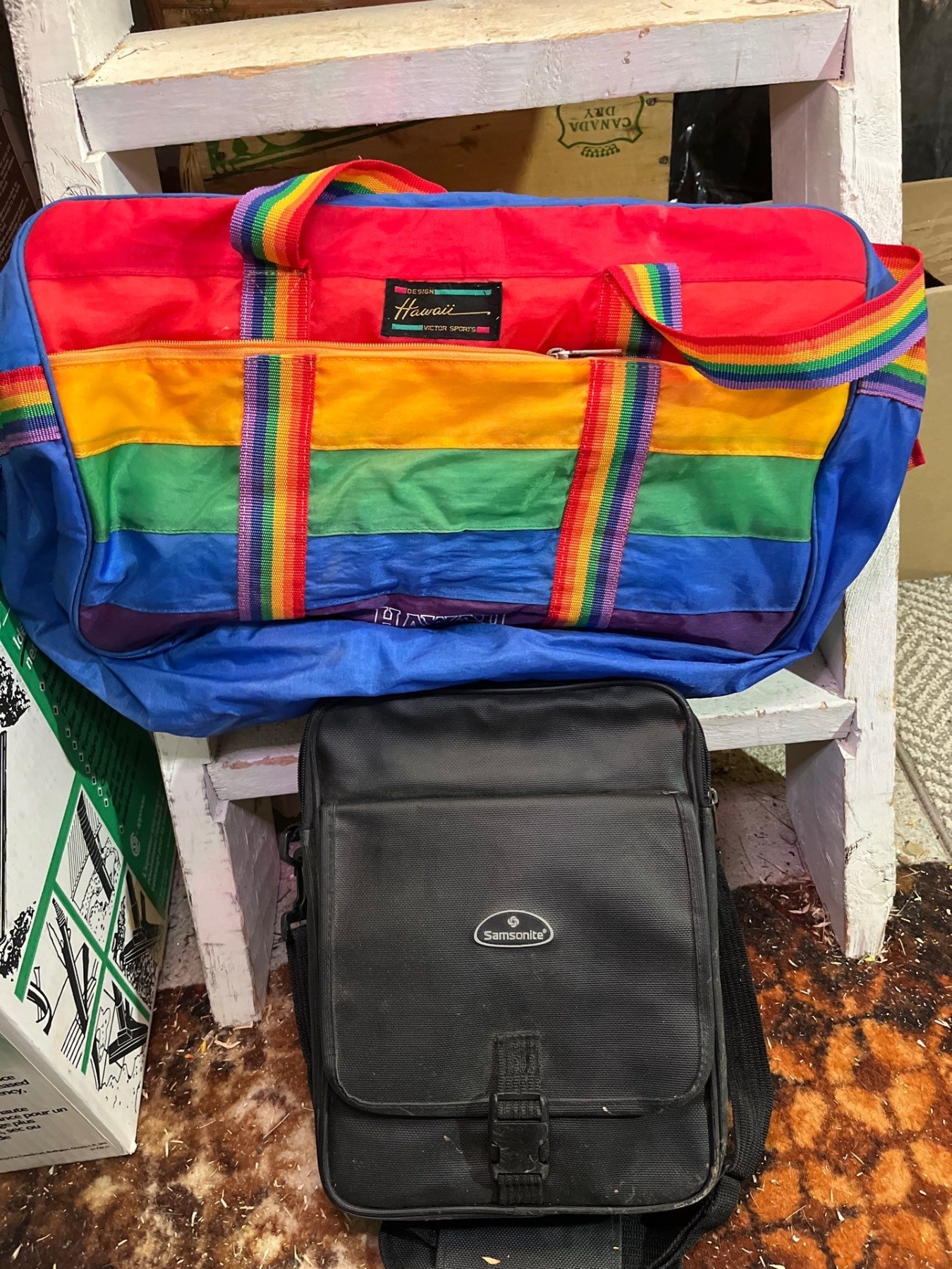 assortment of bags. Sweet retro rainbow bag, samsonite extendable bag
