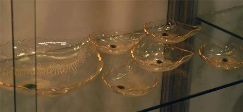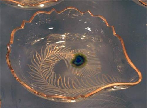 attributed to MOSER BERRY SET, etched, gilt and internally decorated peacock feather design, one 12" serving tray and five matching 5 3/4" low bowls, conditon: excellent.