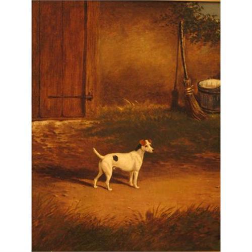 William L.. Turner - Attributed - (British 1820 - 1885) Well known artist for his Jack Russells, this work attributed to W.L.Turner depicts the Champion Fox Terrier "Rival". Interestingly, the signiture on the front side of the canvas reads 'Rival' but is not signed in the name of the artist. The detail and proportion of the dog are well executed - combined with the backround, this makes for a great overall presentation. This oil on canvas and in great condition and is housed in a newer gold leaf frame. The style is very reminiscent of Turner who is a well known painter of sporting dogs and is listed in sporting dog books. Measures 12 x 14. Your complete satisfaction is our goal. If you are not happy with an item purchased, return it in it's original condition for a refund.