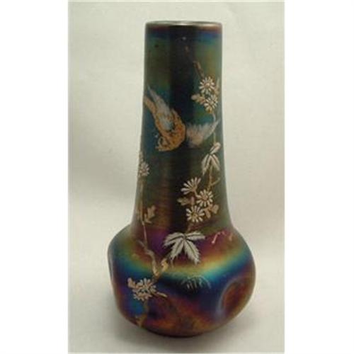 Austrian Loetz-Type Enamel Vase - #'d. The Loetz-Type vase is 9" tall and is cylindrical in shape. The bottom is bulbous and is indented in five times. The hand enameling is beautifully done with only some minor loss of the gold stems, but does not detract from the beauty of this piece. the striking beauty of this vase is the high multi-colored irridescence. It is quite striking, and the photos show exactly what I mean. This vase was hand blown and has a very large polished pontil with a number 2 in it. The top rim is roll and fired polished smooth.