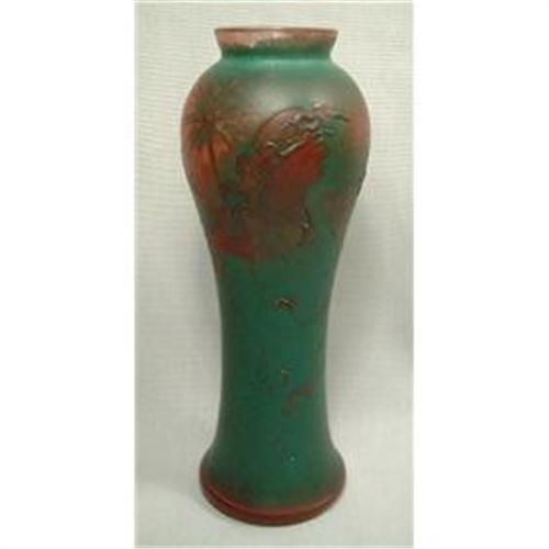 Austrian Faux Cameo Vase. On this vase, the enameling is done in such a way that it looks llke cameo cut, but it is just the enameling. There is not acid or hand cutting on this vase. It depicts a goddes holding a wand with a type of sun-burst effect. The waves and curves are definitely Art Nouveau style. There is no damage to this vase. Please note that there are sections of this vase where it is a brownish color and most of the or 90 percent of the vase is the green stain or enamling. In my opinion, looking at it closely, I do not believe that the green worn away from the vase, but was intentionally done this way. The vase is 8 1/2" tall and has an excellent feel to it. it weighs 14 1/2" ounces. It is numbered and signed with the letter "k".