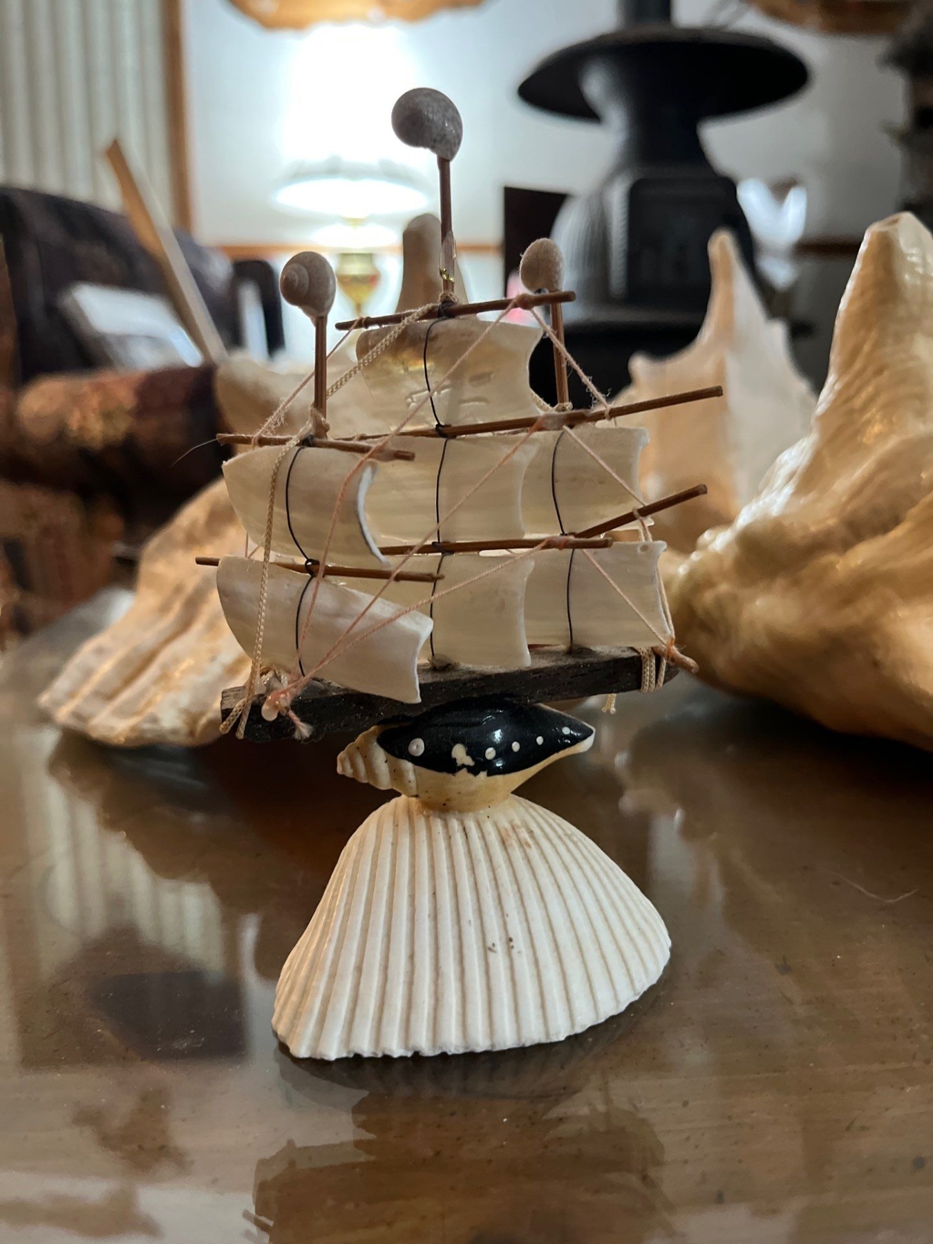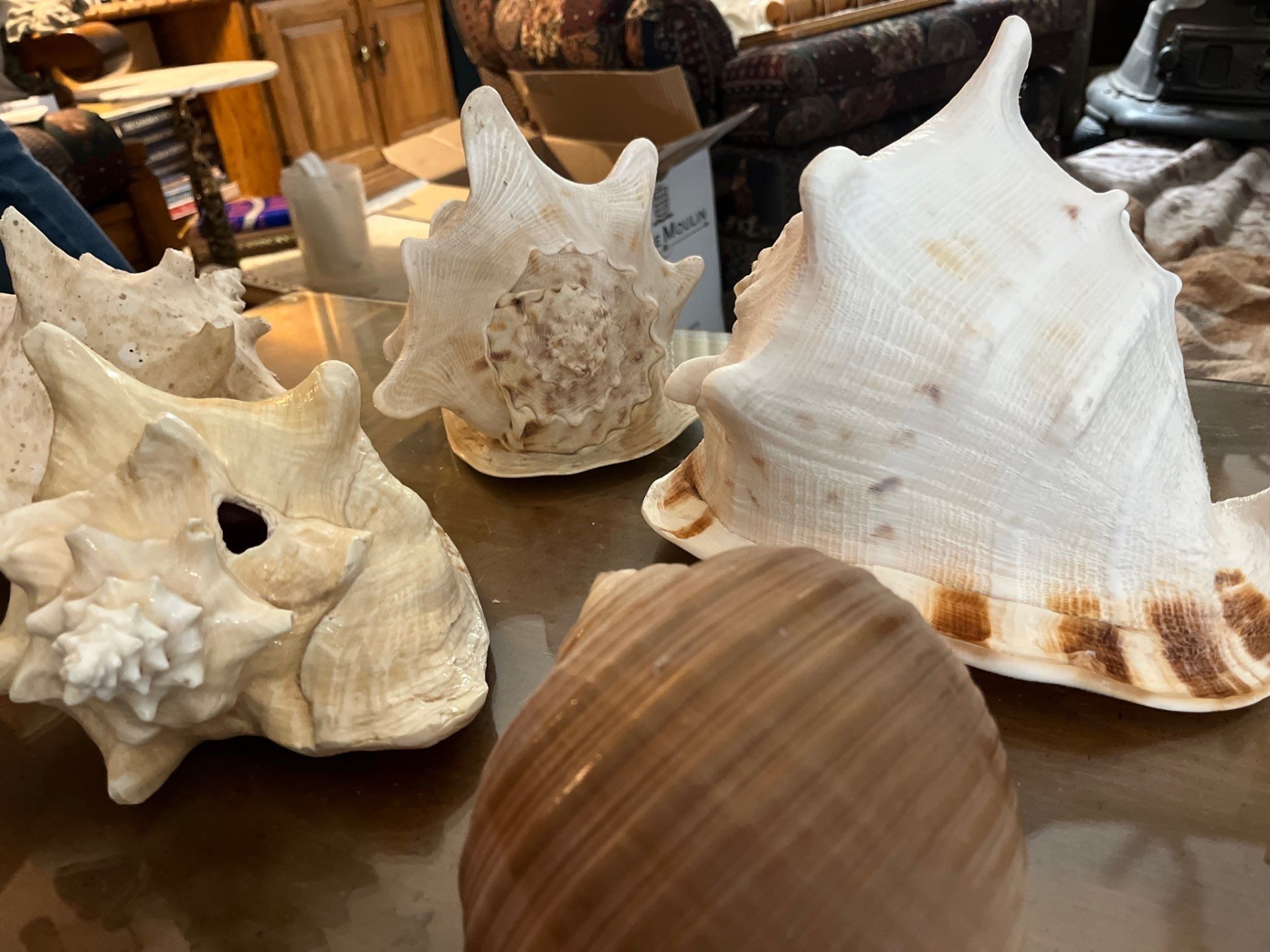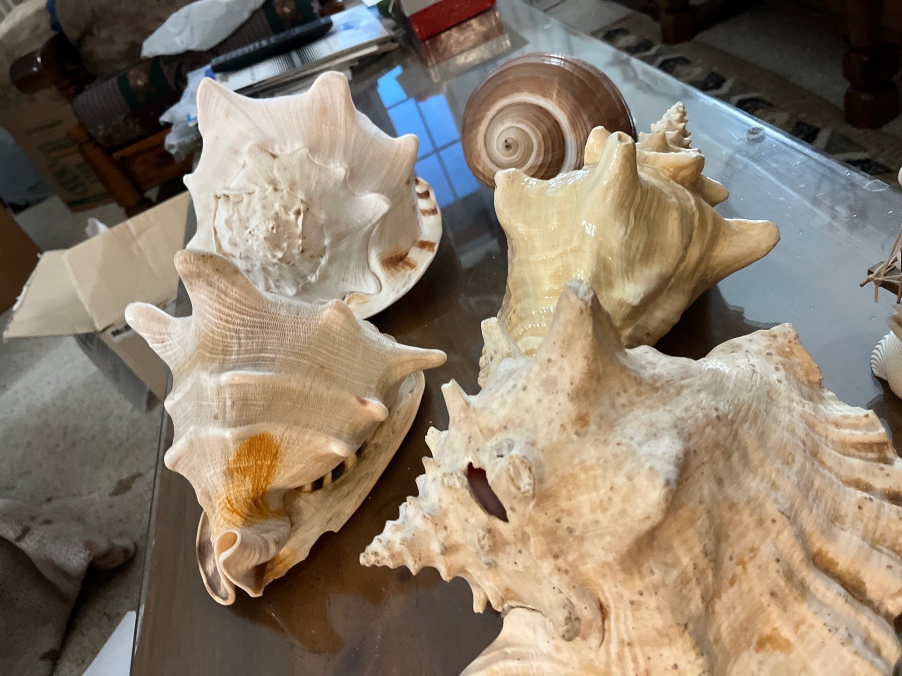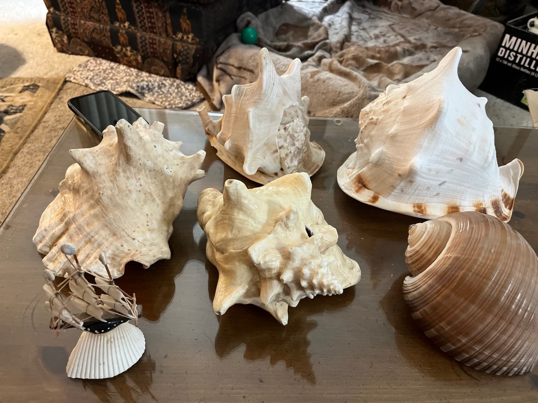authentic conch, shells 4 in total with giant snail shell and small shell sailboat.