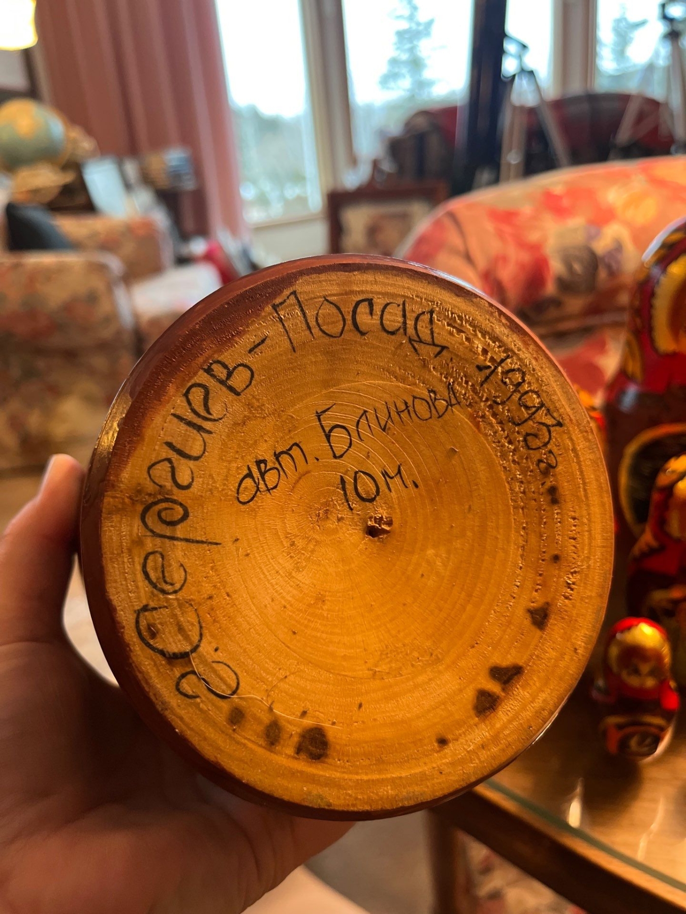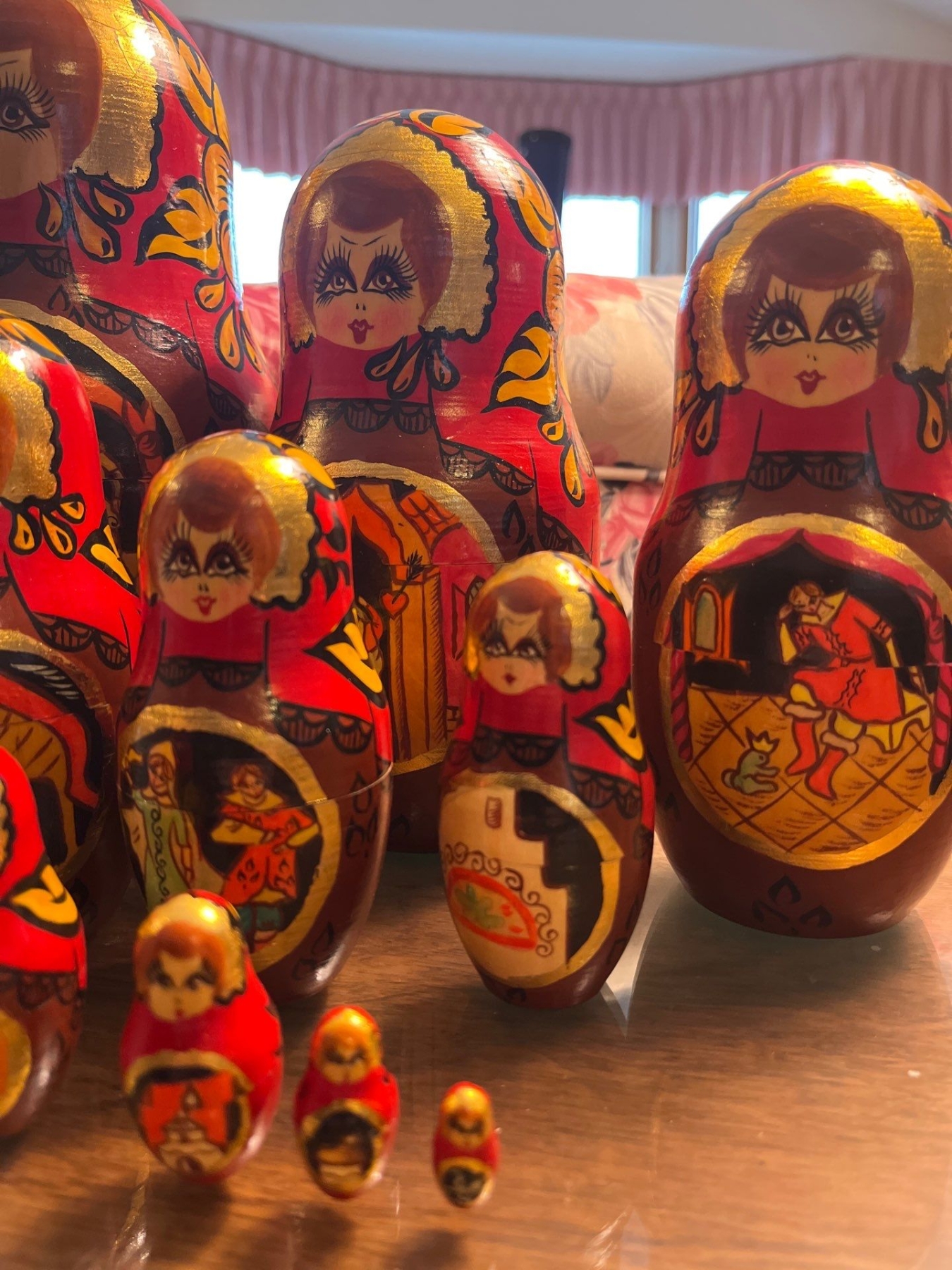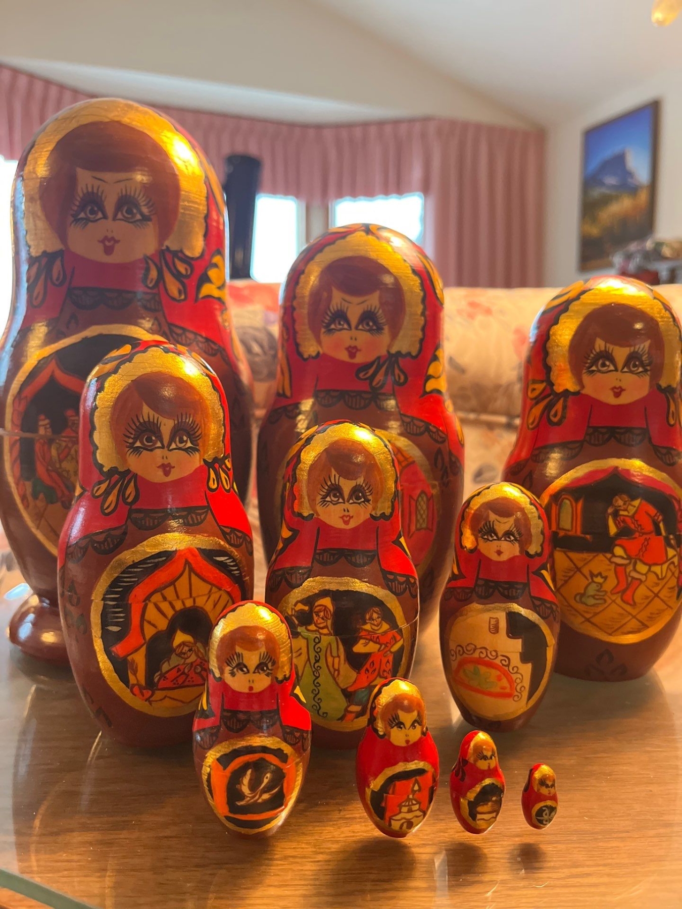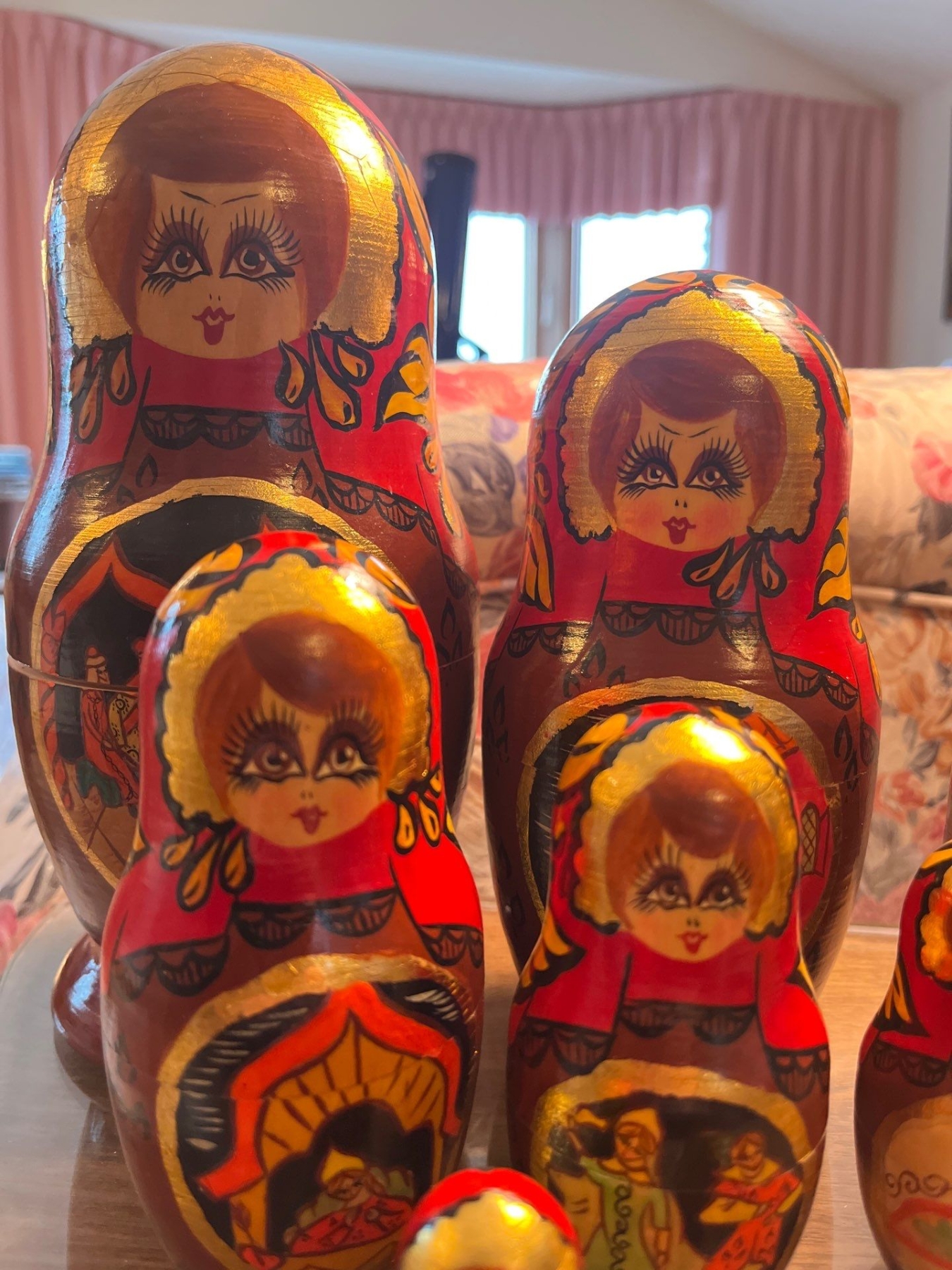 authentic red hand, paint Russian nesting dolls with gold pinstriping 10 pieces 10”
