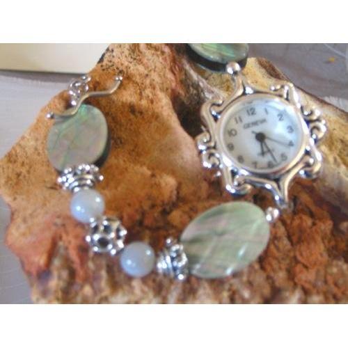 Your time! Large flat oval shell beads, White lace agate rounds, Sterling silver bead caps, Sterling silver beads. Bali sterling silver toggle clasp, easy on, yet secure!<p>Geneva, quartz watch face. water resistant.<p>A great look. I think this design came out beautiful. How fun and stylish. At 8 inches, this will fit a variety of wrists, whether you want this snug or worn loose, as a bracelet.<p>A treasure for sure! The neutral, earthy colors will go with most any outfit, any color! special orders welcome-email me if you would like this re-sized. Thanks for looking~be sure to check out all my new creations!  <p> Shimmer