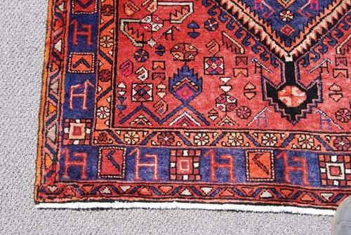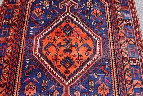 beautiful hand woven nahavand design persian rug, size 4.9 x 8.11 feet color abrash navy blue, red - multi-colored knot technique 100% hand knotted rug foundation cotton pile 100% fine wool. made in persian dying material vegetable dye.