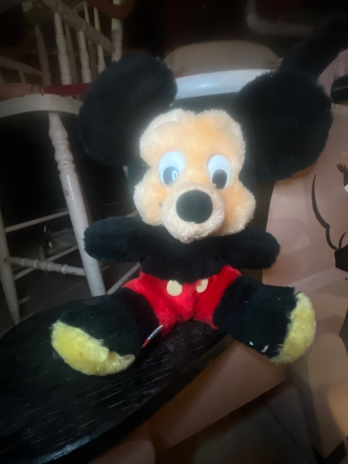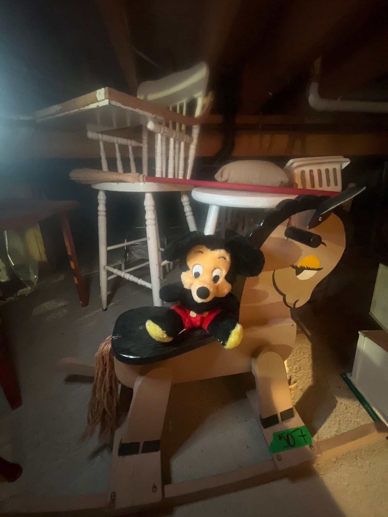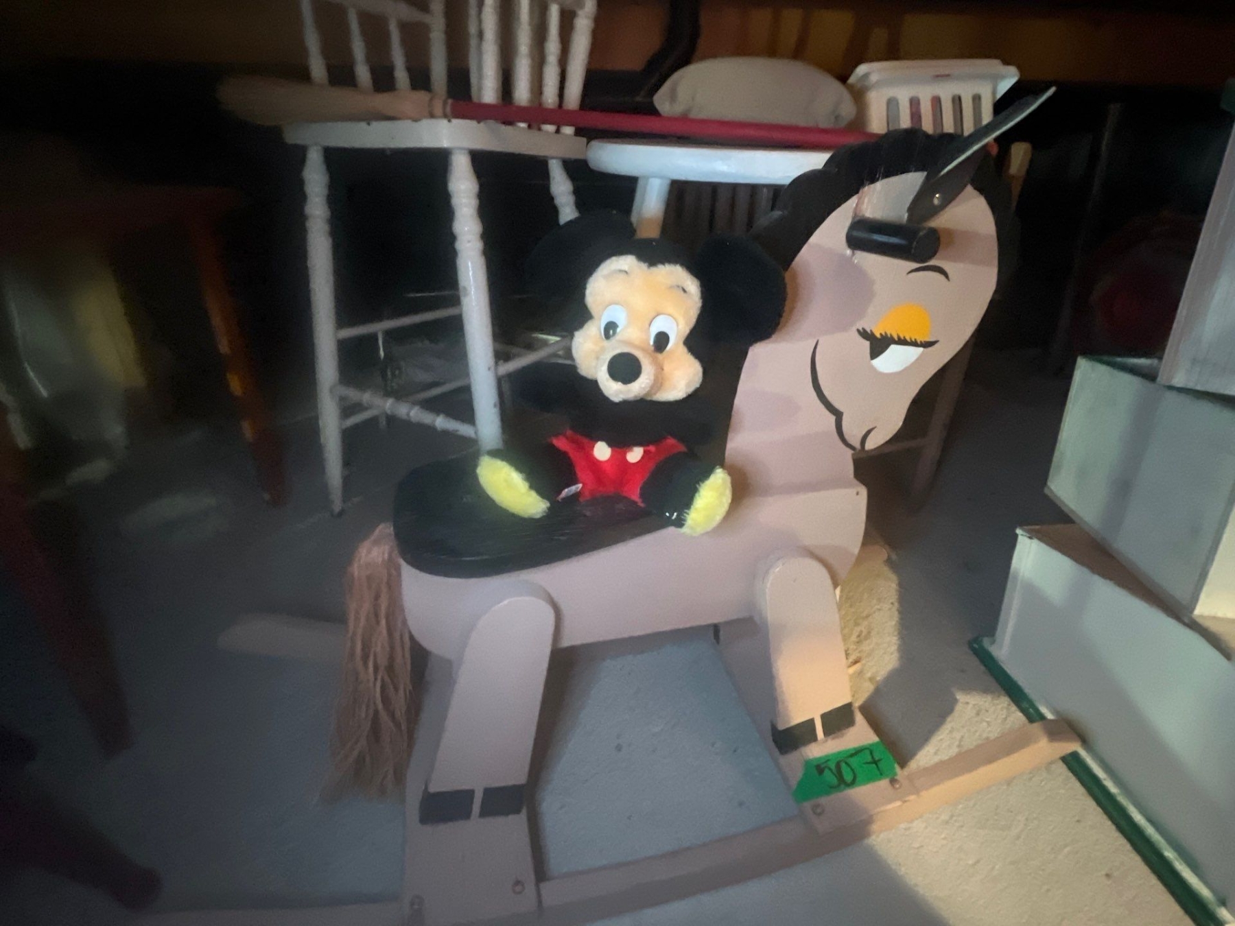 beautiful, handmade, rocking horse with highchair and stool and doll cradle and two strollers along with a vintage Mickey Mouse product of Korea from Walt Disney productions.
