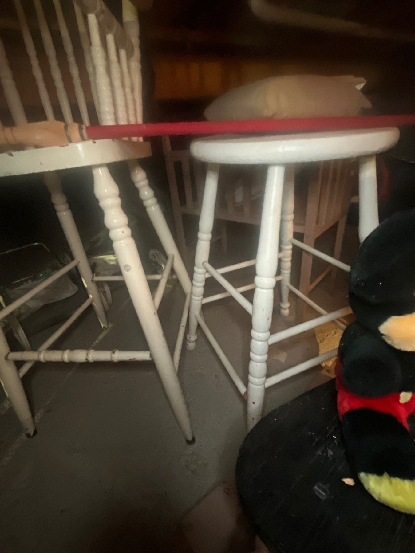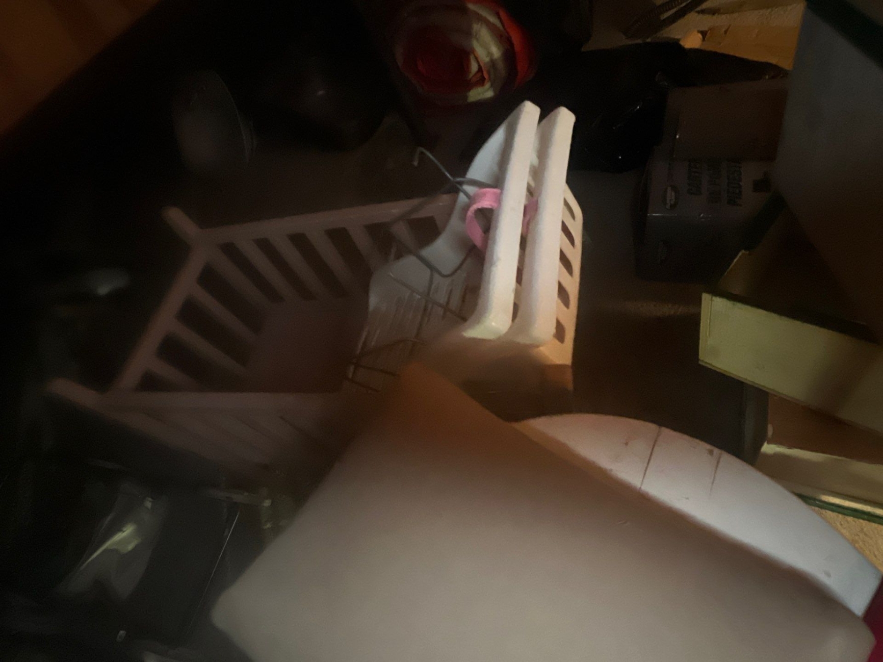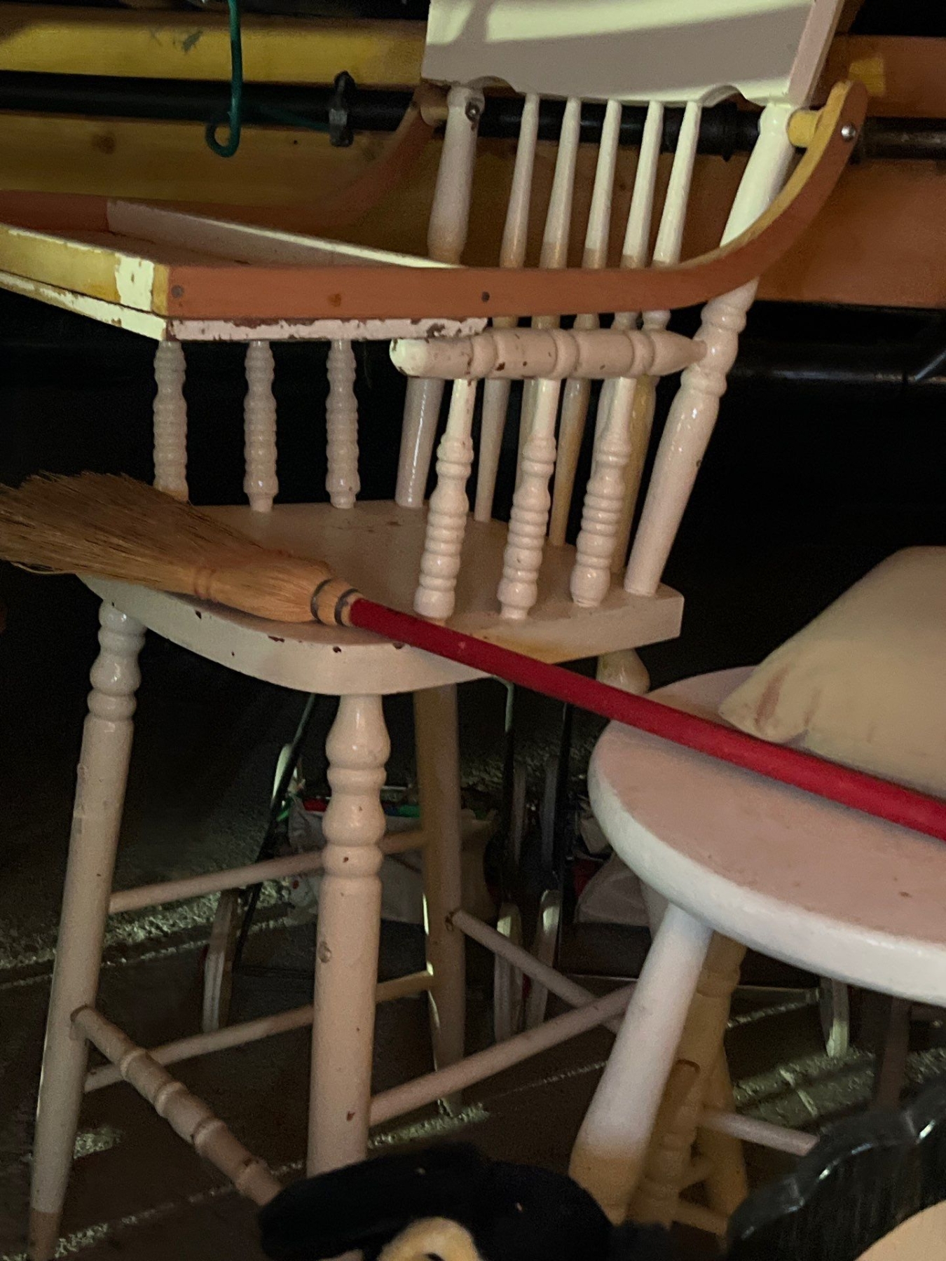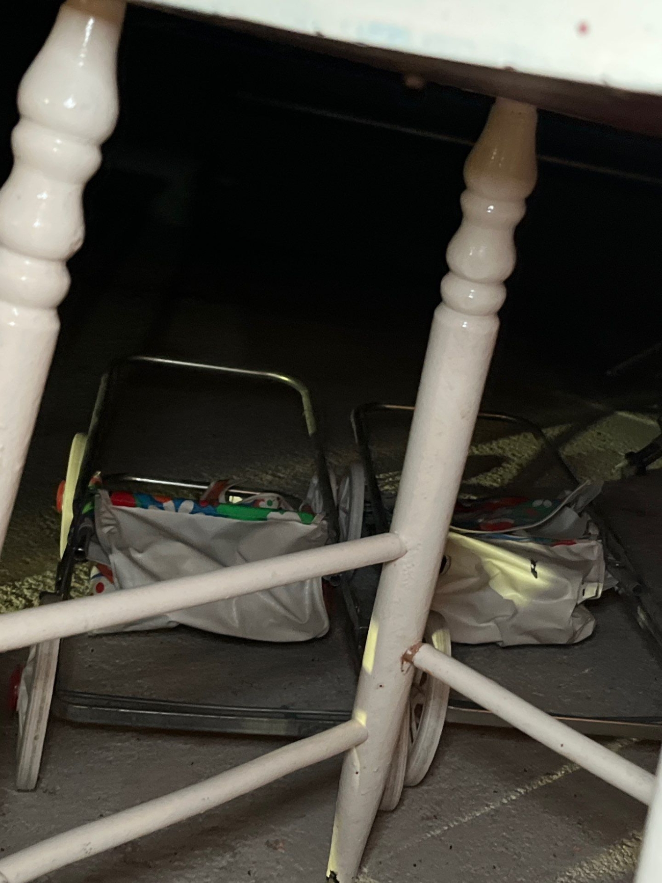 beautiful, handmade, rocking horse with highchair and stool and doll cradle and two strollers along with a vintage Mickey Mouse product of Korea from Walt Disney productions.