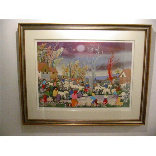 European Multi color serigraph ARTIST DEPAOLA listed signed and numbered with pencil.with people, sheeps and trees on the background of blue and purple sky. it is magnificent with gold and silver stylish frame and is in excellent condition. the certificate of authenticity on the back signed. it has European Flair! it is decorative, collectible and magnificent . 29.5 " T. x 36.5 " W. and 1.5 depth.
