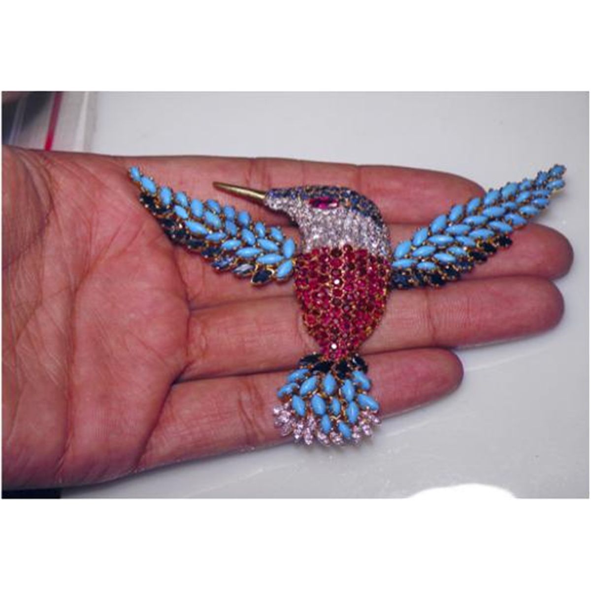 18K Gold, Diamond and Multi Gem Hummingbird Brooch, containing 120 round brilliant cut diamonds weighing approximately 2.20 carats total, 70 round brilliant and one marquise shape rubies weighing approximately 5.42 carats total, 60 marquise shape turquiose weighing approximately 13.76 carats total and 64 round brilliant and marquise shape sapphires weighiing approximately 2.06 carats total, brooch measures approximately 80 x 64 mm.Originally priced $34,500. Signed Bianco 18K