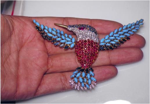 18K Gold, Diamond and Multi Gem Hummingbird Brooch, containing 120 round brilliant cut diamonds weighing approximately 2.20 carats total, 70 round brilliant and one marquise shape rubies weighing approximately 5.42 carats total, 60 marquise shape turquiose weighing approximately 13.76 carats total and 64 round brilliant and marquise shape sapphires weighiing approximately 2.06 carats total, brooch measures approximately 80 x 64 mm.Originally priced $34,500. Signed Bianco 18K