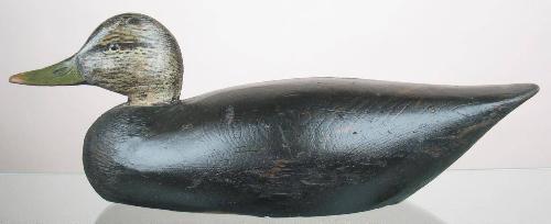 Outstanding example of a "Pequaw Honk Club" black duck by A. E. Crowell, E. Harwich, MA. Used at "Quicksand Pond" in Westport, MA. In XOC with glass eyes and a heavily rasped slightly turned head. Numerous minor dings, light wear to the edges of bill and tail, narrow tight check (approx 4") on the top of the body ending at a circular knot in the wood. Legible impressed brand on the bottom. One of the finest PHC black ducks we've seen.