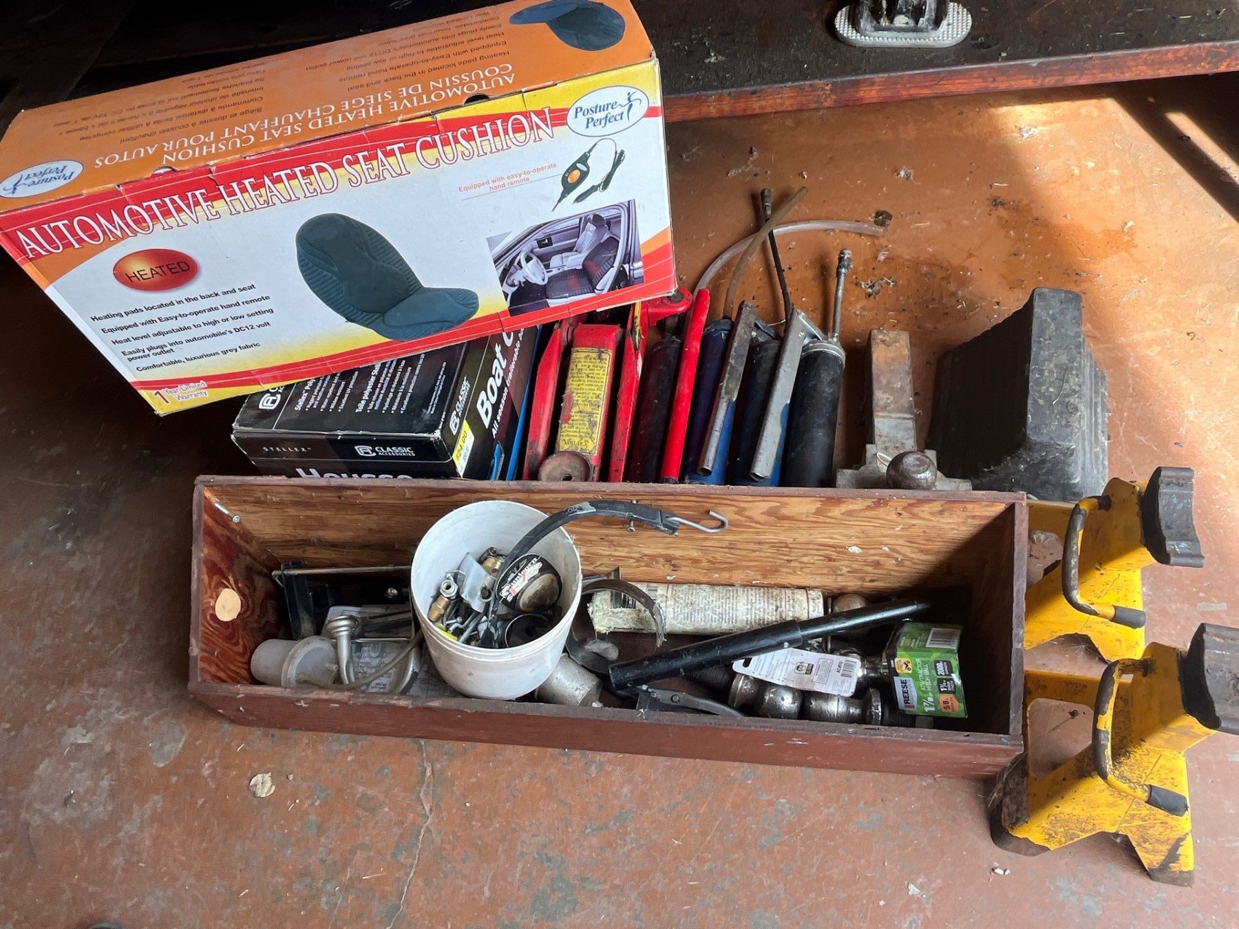 boat cover jacks Jack stand toolbox full of balls for hitches and a heavy duty hitch along with a number of grease guns and wheel chock