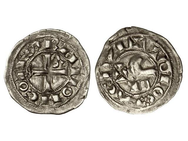 Óbolo. (1148-1249). RAIMUNDO V-VII. TOLOSA. Anv.: ¶RAMON COMES. Cruz central con S en 2º espacio. Rev.: TOLOSA CIVI. Monograma PAX en centro. AR. MBC.