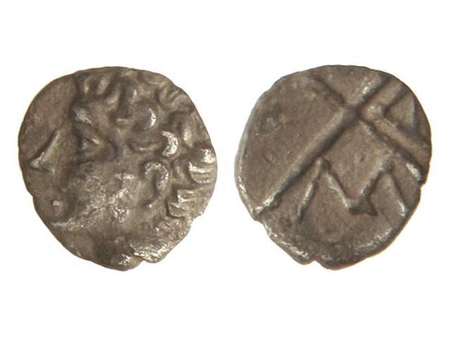 Óbolo. 400 a.C. MASSALIA. Anv.: Cabeza de Apolo a izquierda. Rev.: Cuatro cuarteles, M. A. en dos de ellos. 0,50 grs. AR. Se-72 sim. MBC.