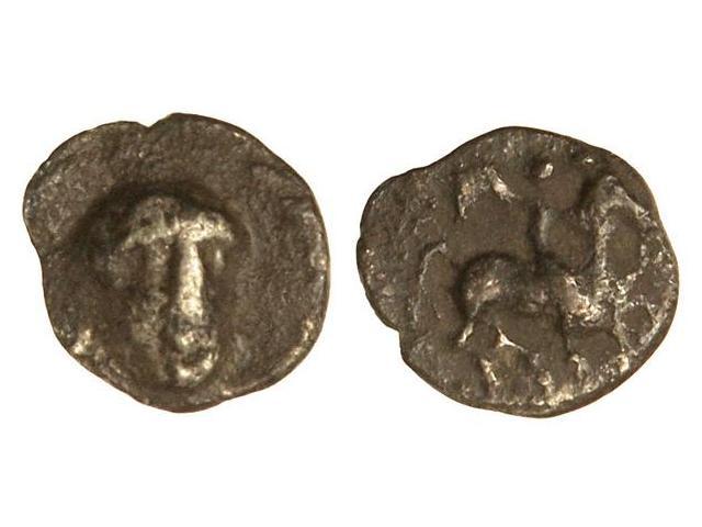 Óbolo. EMPORITON. Anv.: Cabeza femenina de frente ligeramente ladeada a derecha. Rev.: Jinete a derecha con clámide. 0,80 grs. AR. Vill-18 Sim. MBC/MBC-.
