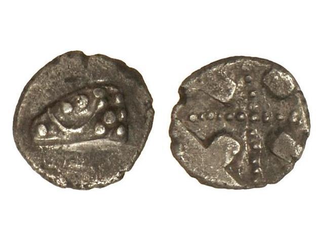 Óbolo. - Siglo IV a.C. - EMPORION. FRACCIONES ANTERIORES A LAS DRACMAS. - Anv.: Cabeza de carnero a izquierda. Rev.: Cruz de puntos en zona incusa. 0,60 grs. AR. Vill-2. EBC-. - -